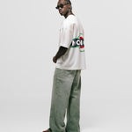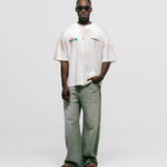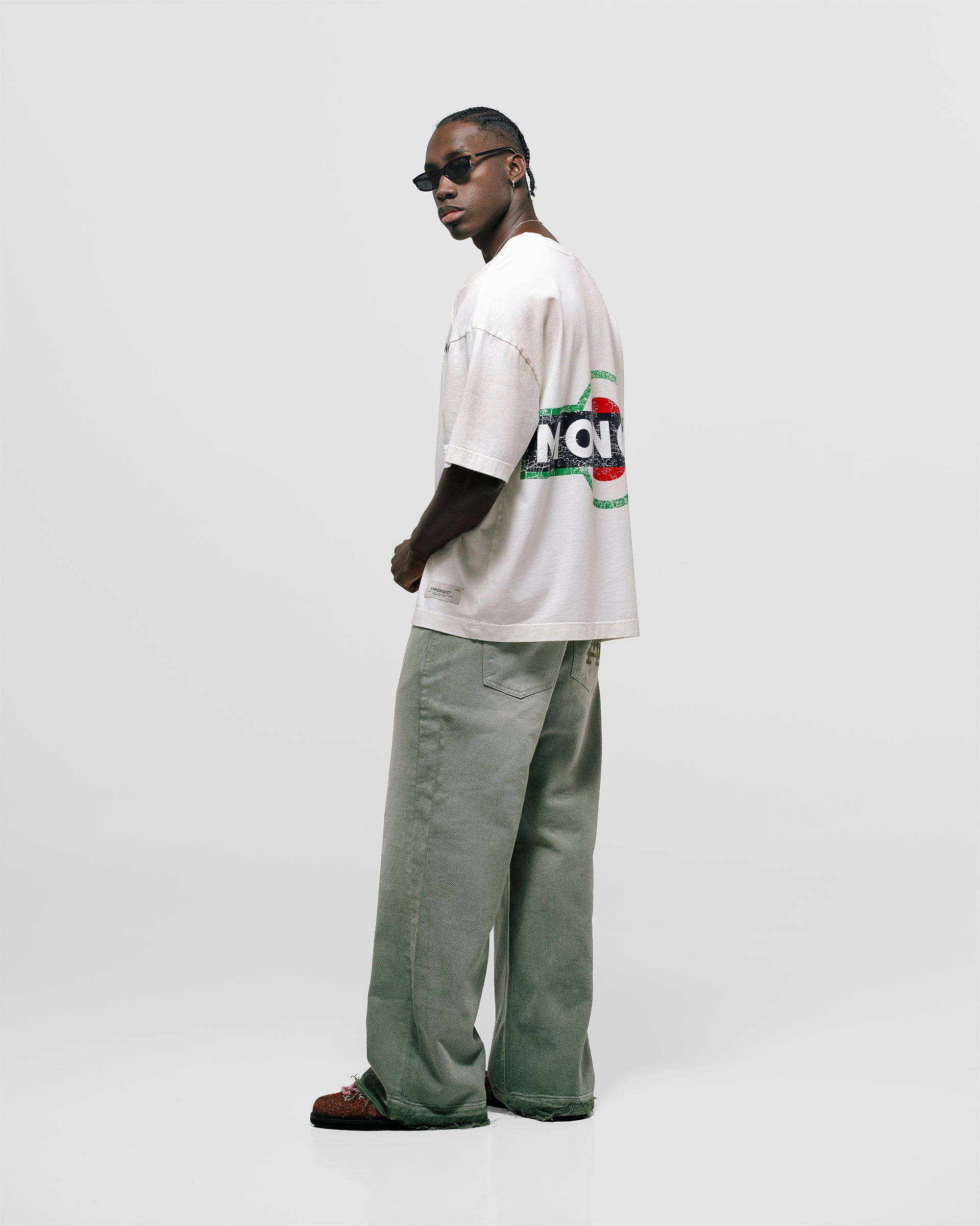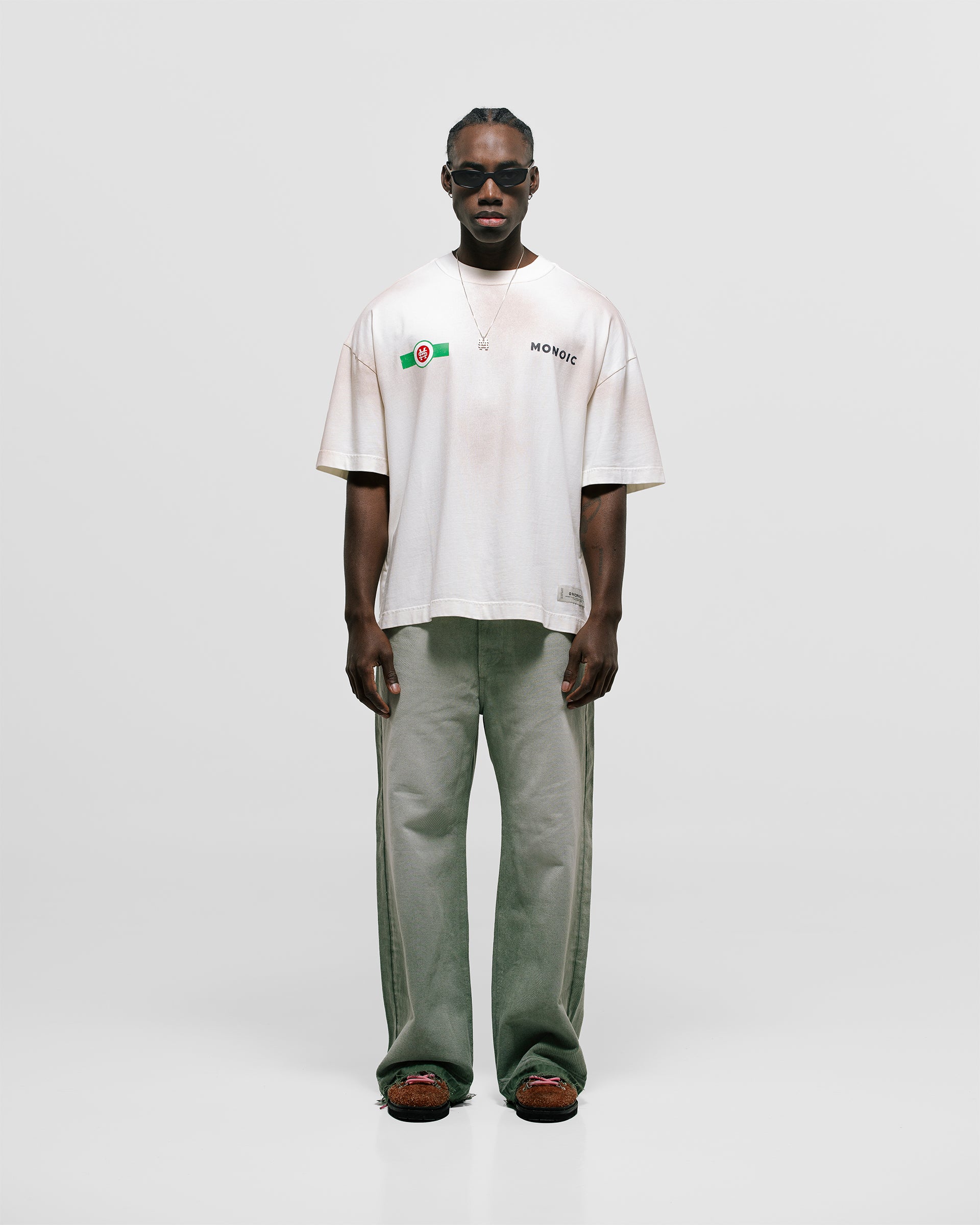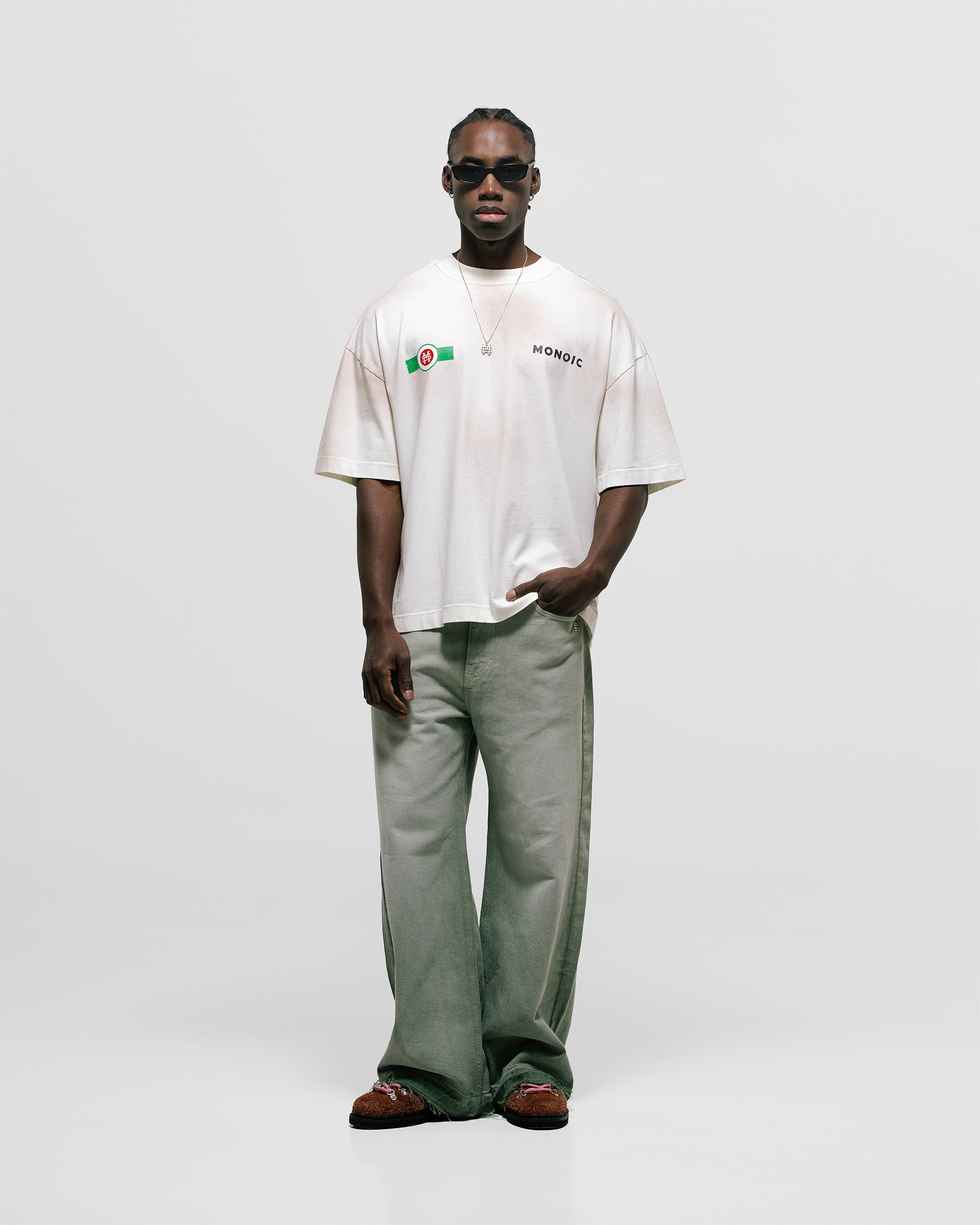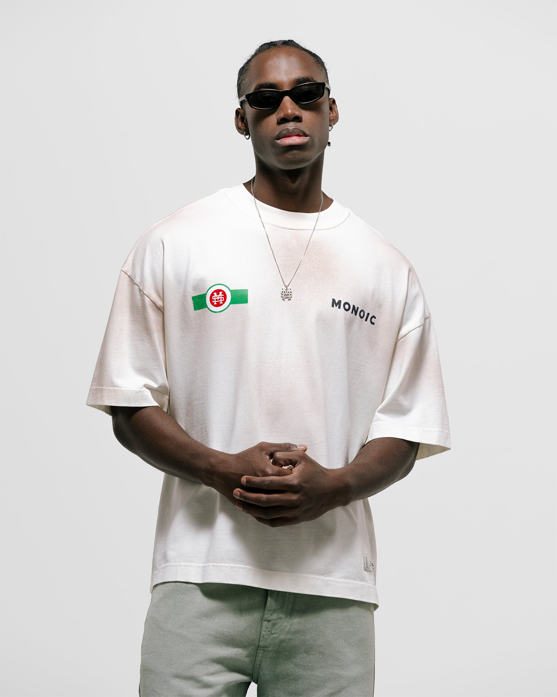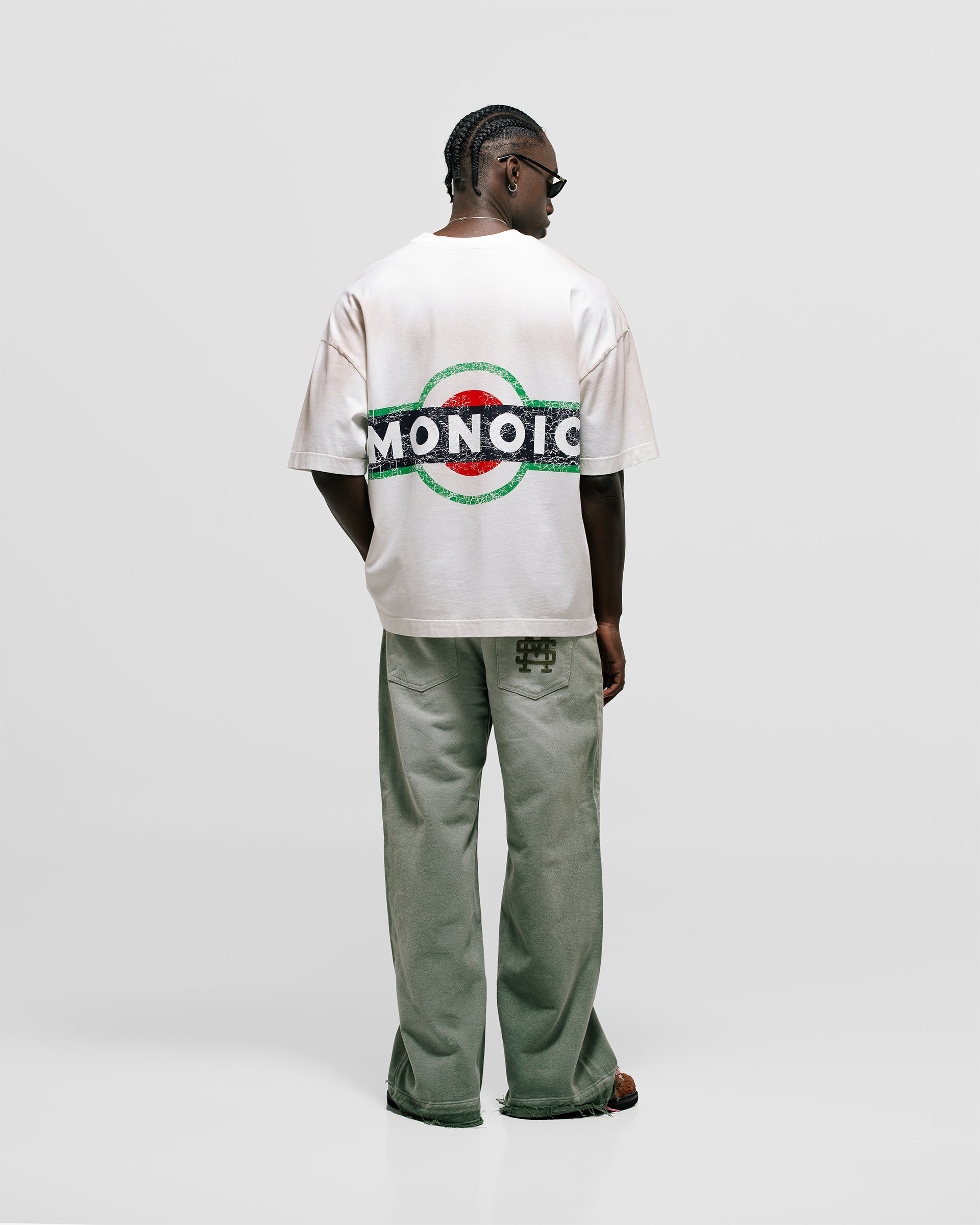 Camiseta Boxy Fit color Blanco Hueso (Egret), confeccionada en 100% algodón. Presenta estampados con efecto desgastado en la espalda y en ambos pectorales, y manchas en aerosol que aportan un look usado. Incluye marquilla tejida MONOIC en el lateral izquierdo.