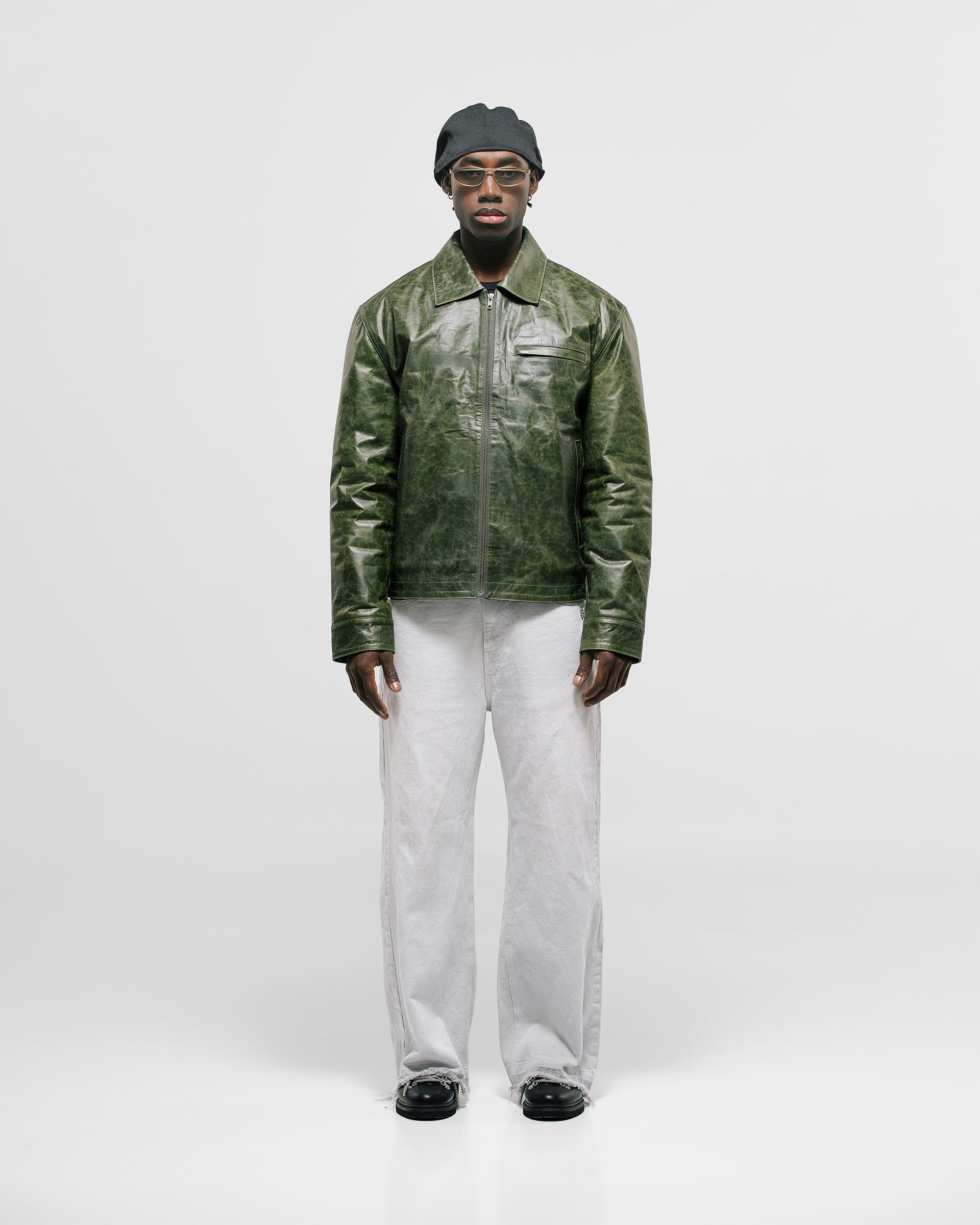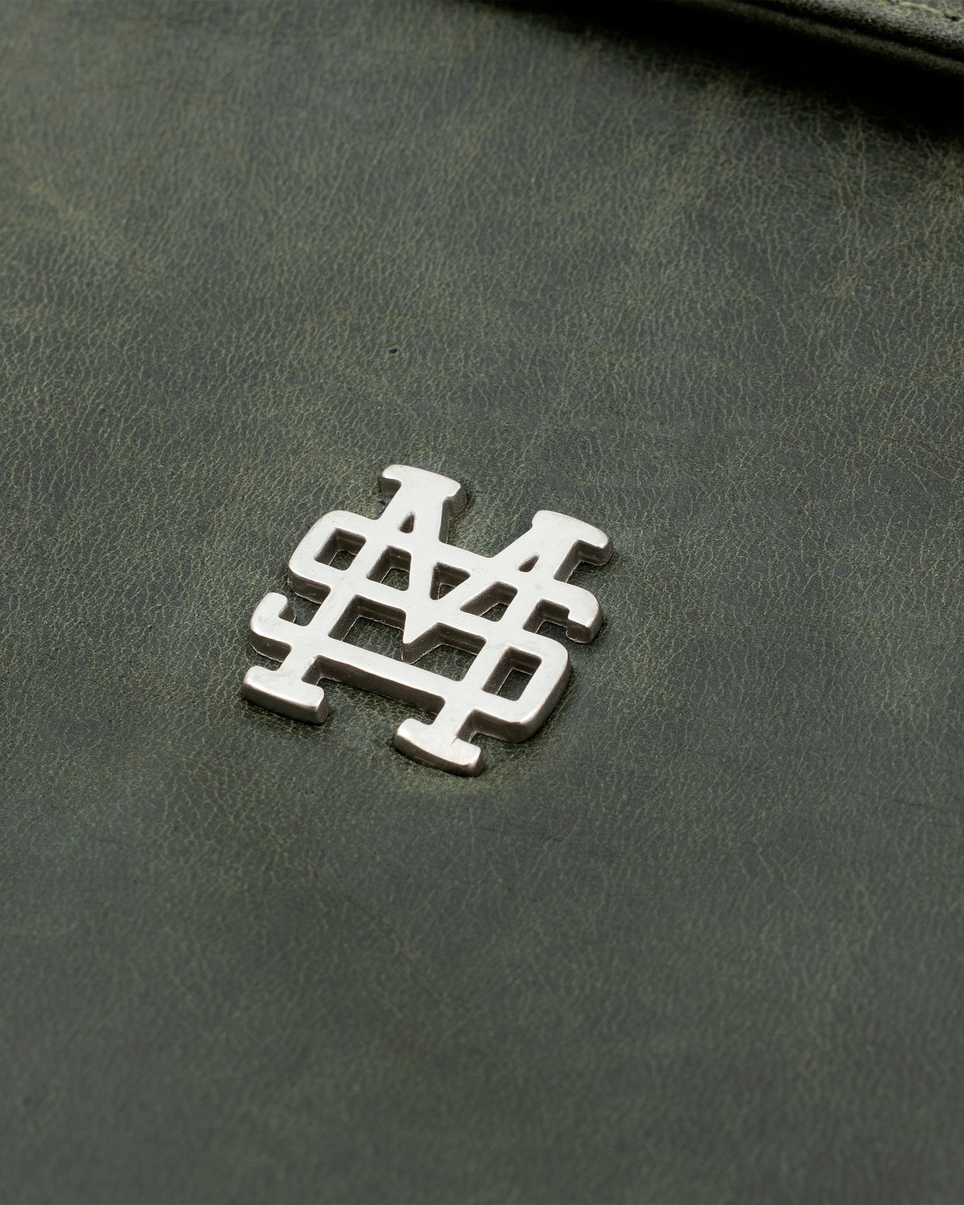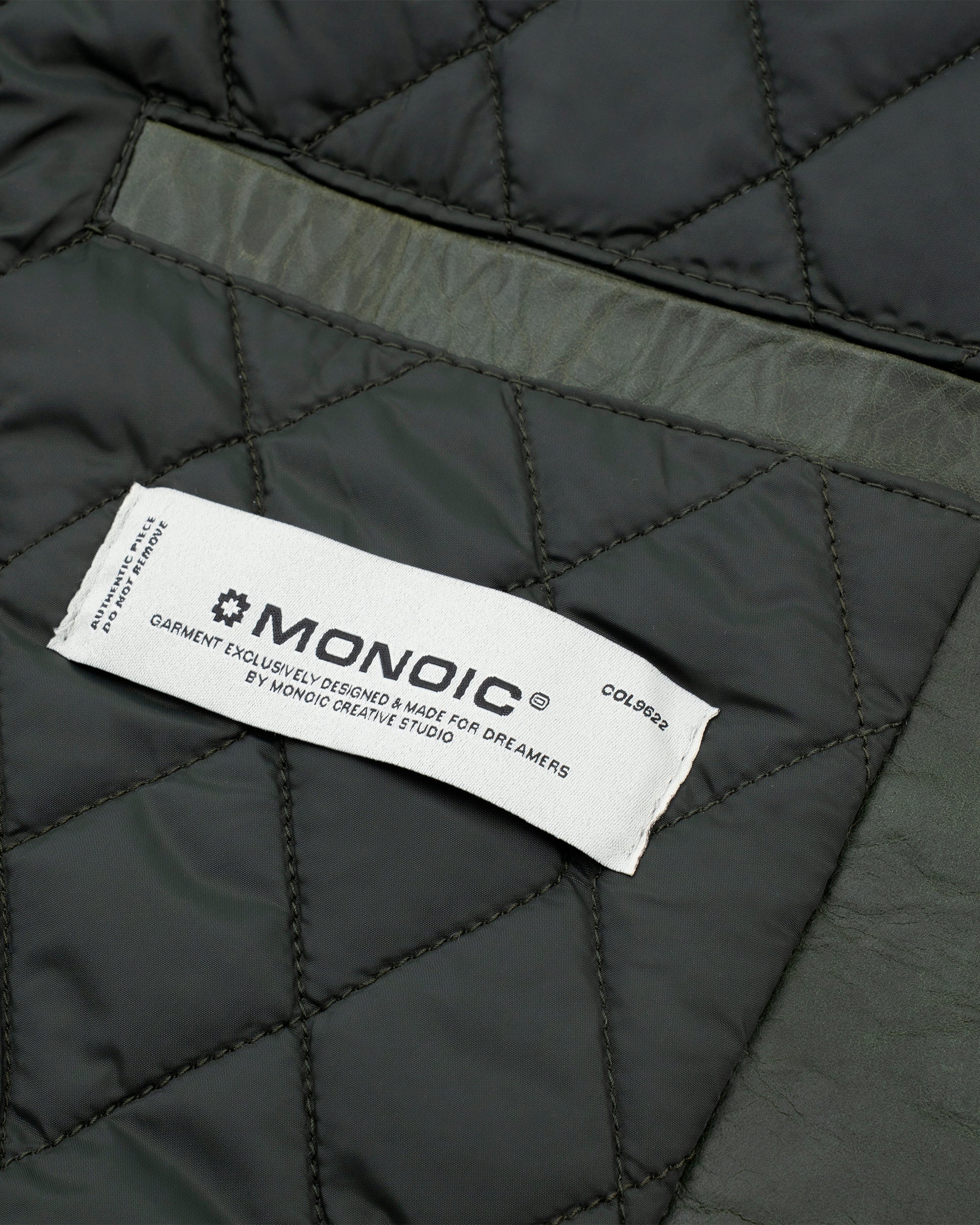 Chaqueta Monogram Leather hecha en cuero 100% con un proceso desarrollado por MONOIC durante más de 6 meses. Verde oliva desgastado con textura tipo "papel" que entrega un acabado vintage único. Fit boxy, elegante y pensado para elevar cualquier look. Monograma metálico centrado en la parte trasera del cuello. Forro interior acolchado en rombos. Edición limitada.