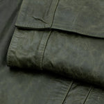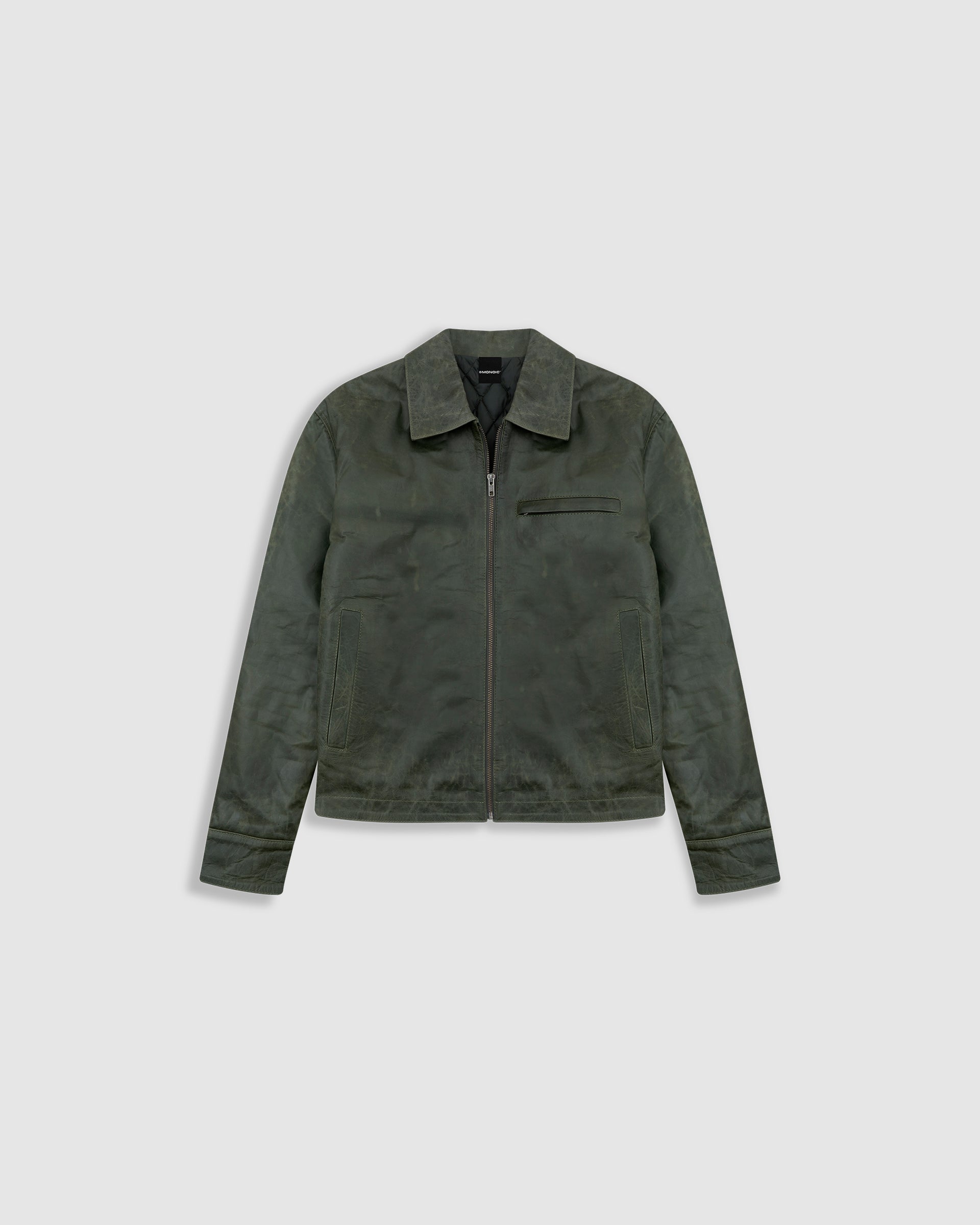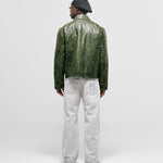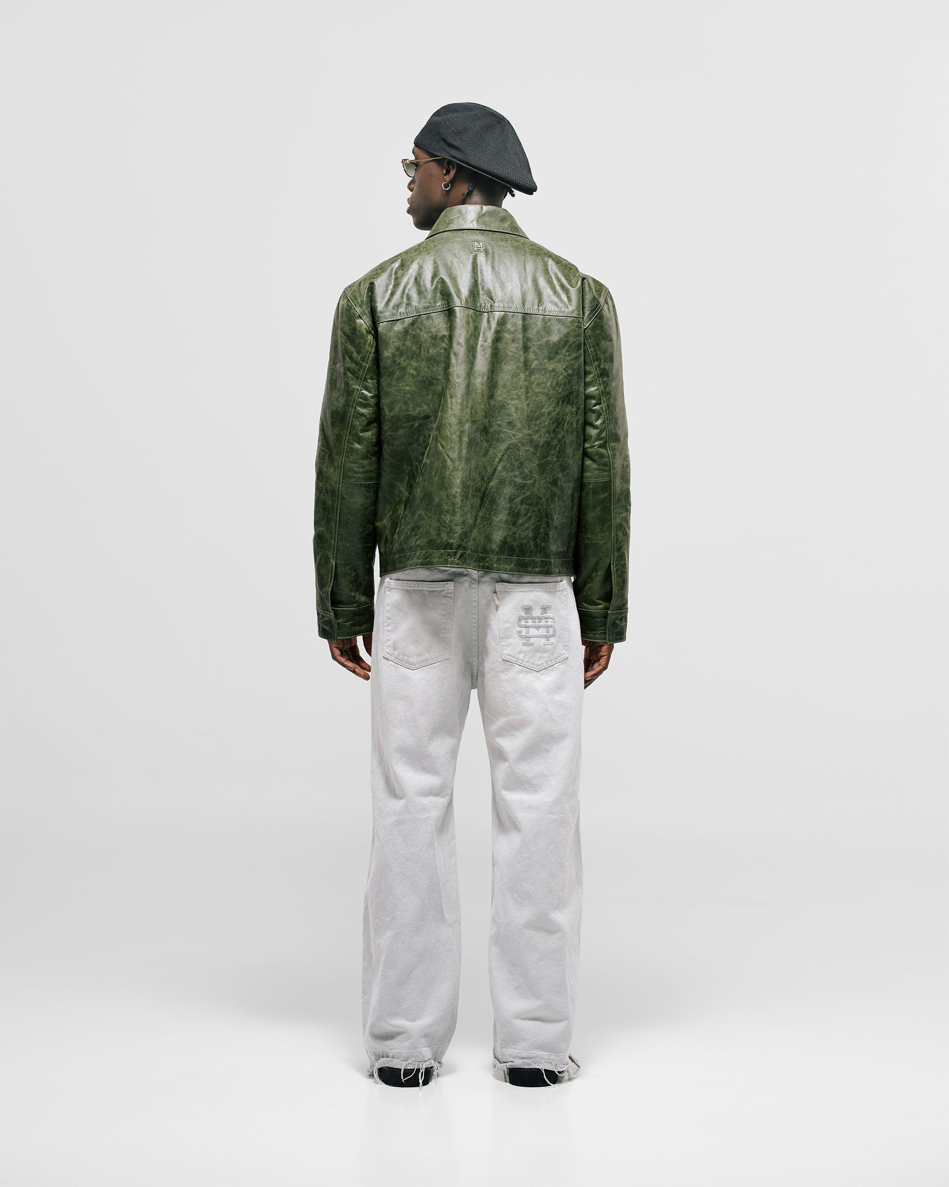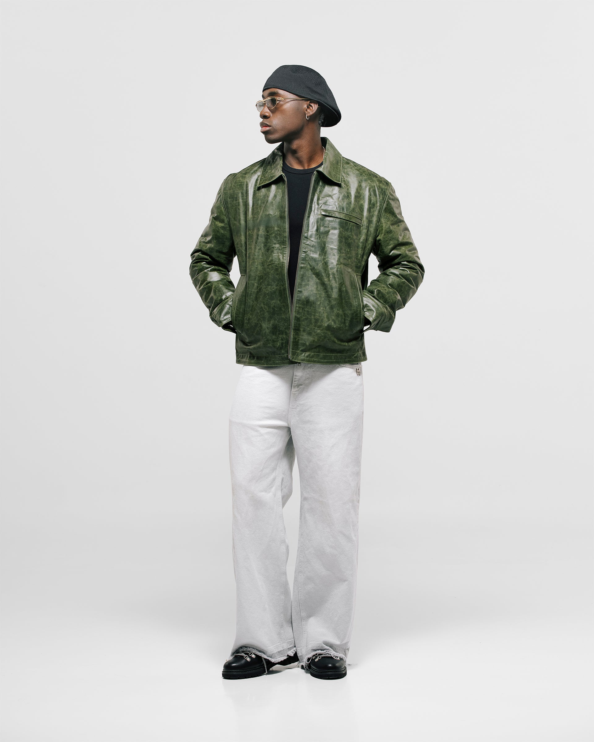 Chaqueta Monogram Leather hecha en cuero 100% con un proceso desarrollado por MONOIC durante más de 6 meses. Verde oliva desgastado con textura tipo "papel" que entrega un acabado vintage único. Fit boxy, elegante y pensado para elevar cualquier look. Monograma metálico centrado en la parte trasera del cuello. Forro interior acolchado en rombos. Edición limitada.