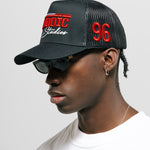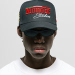 Gorra Monza en color Negro Oscuro, con horma Trucker de 5 paneles y diseño Snapback ajustable. Elaborada en 50% algodón y 50% poliéster, presenta bordados en alto y bajo relieve en letras rojas con acentos en verde y amarillo. Incluye marquilla interior.