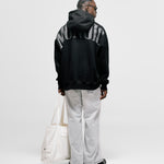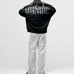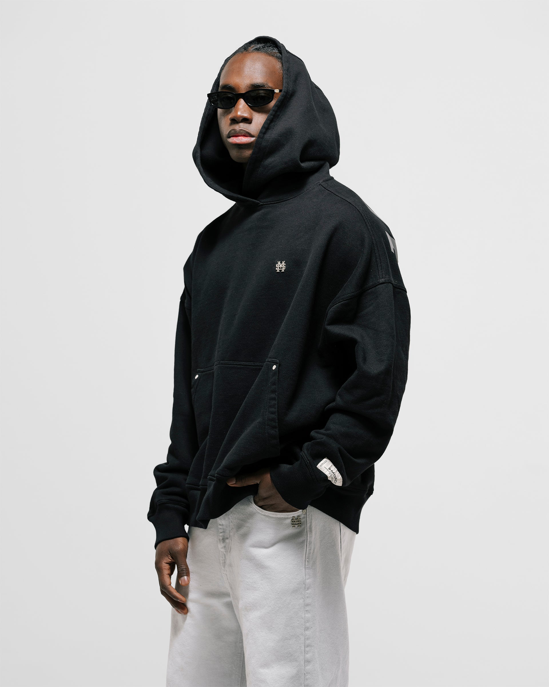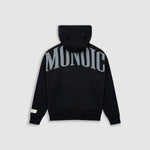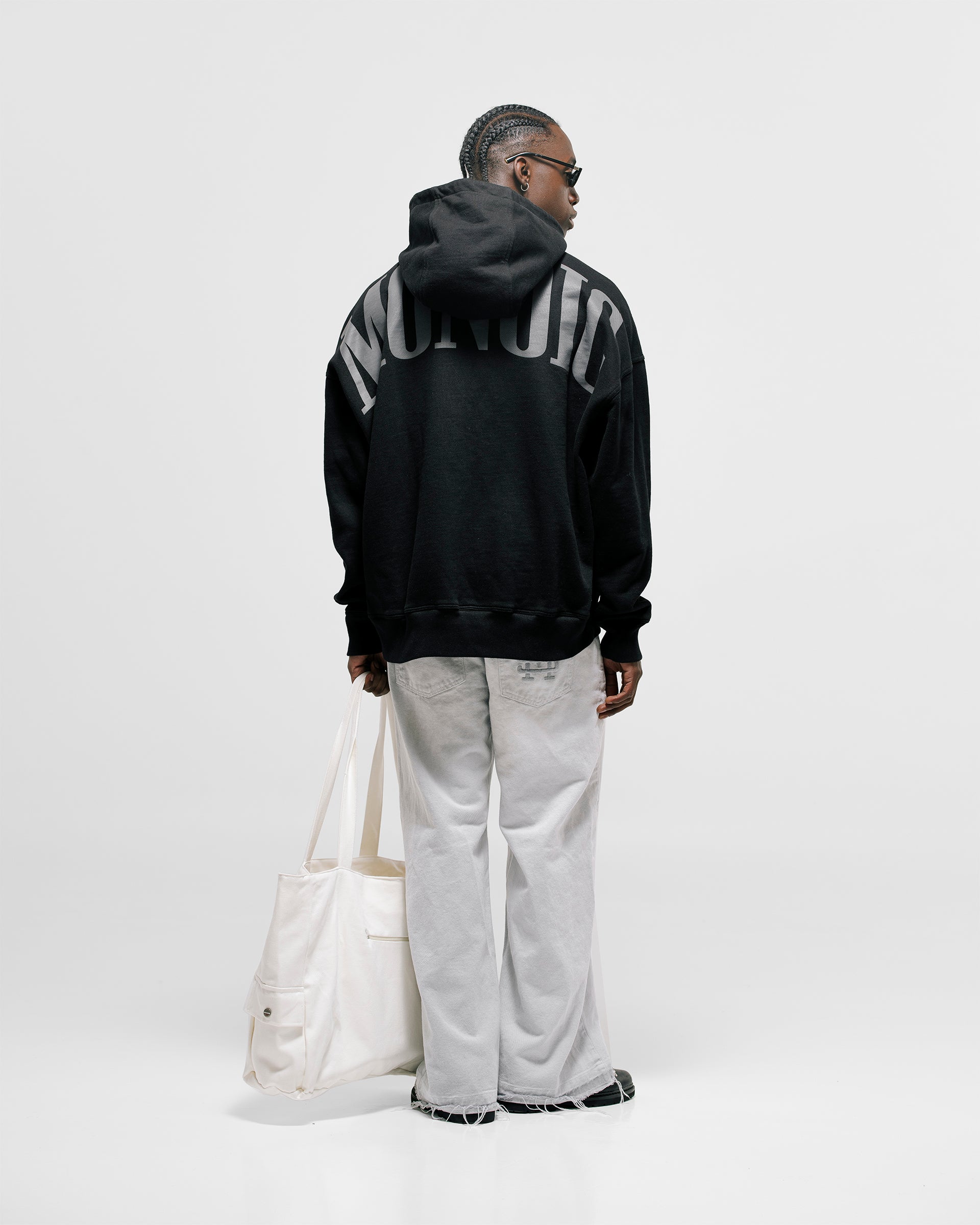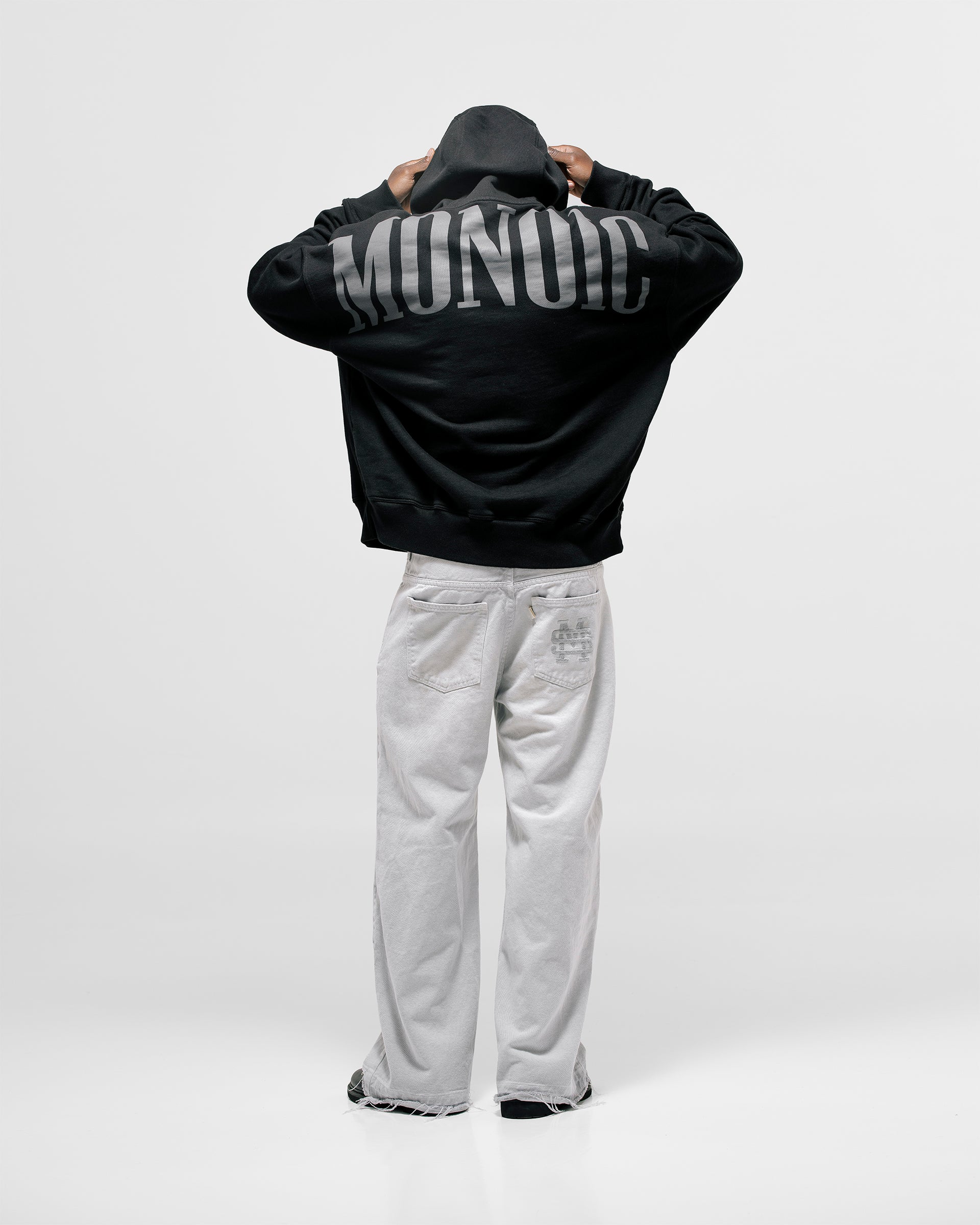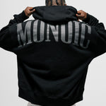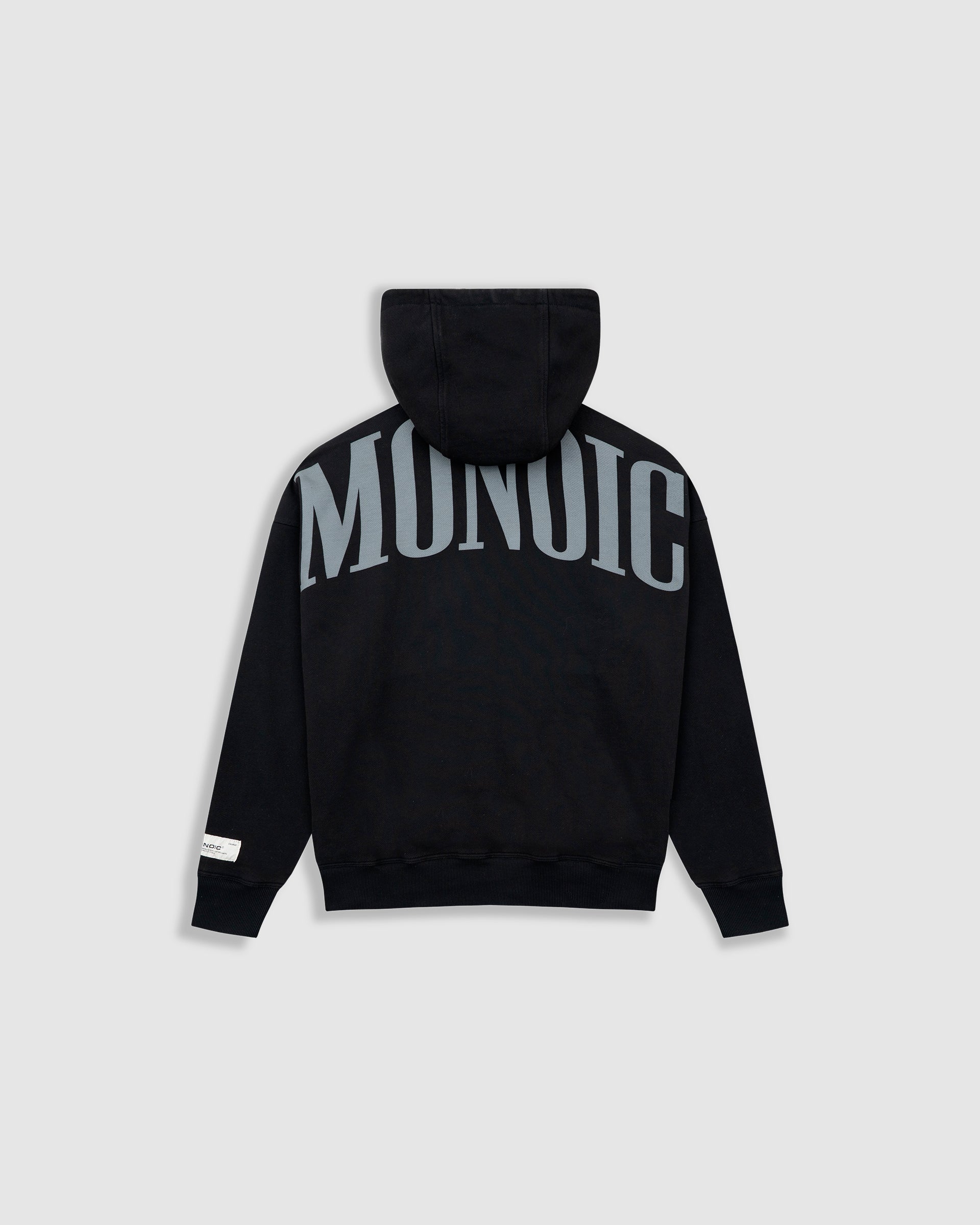 Hoodie Oversized color Negro Oscuro, confeccionado en 100% algodón. Presenta estampado “monoic” en gris hecho en serigrafía ubicado en la espalda y monograma metálico en el pectoral izquierdo. Incluye bolsillo tipo canguro frontal con remaches metálicos y marquilla MONOIC en la manga izquierda.