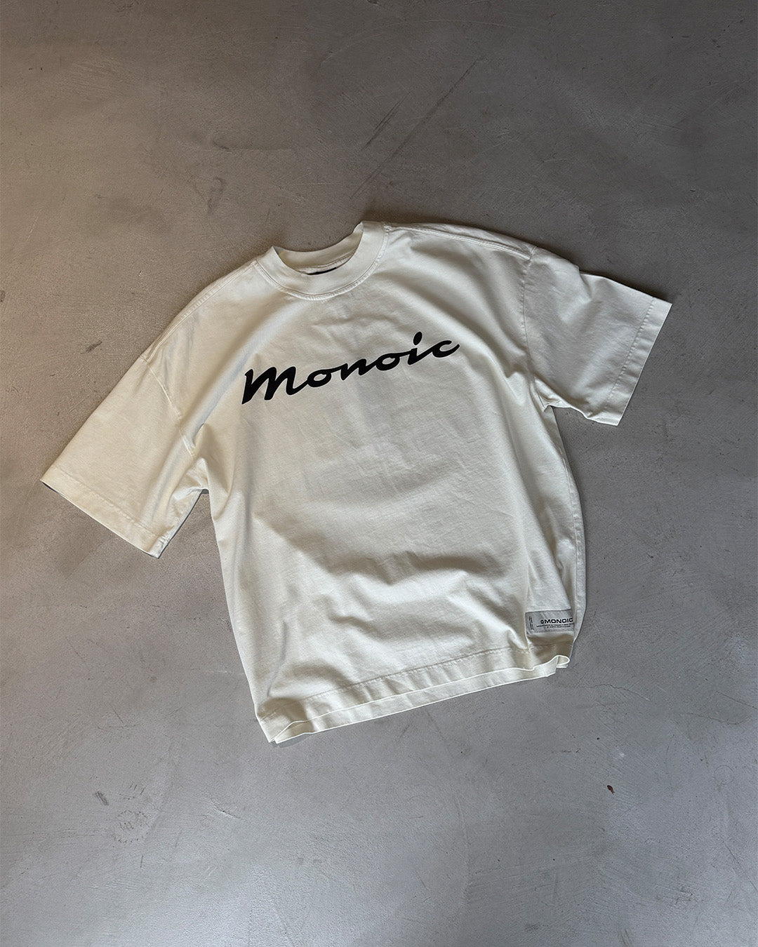 Camiseta Boxy Fit color Off White (Egret), en 100% algodón de alto gramaje. Gráficos en serigrafía: estrella MONOIC en la espalda y “Monoic” centrado en el pecho. Cuello redondo en rib y marquilla tejida MONOIC en el lateral izquierdo.
