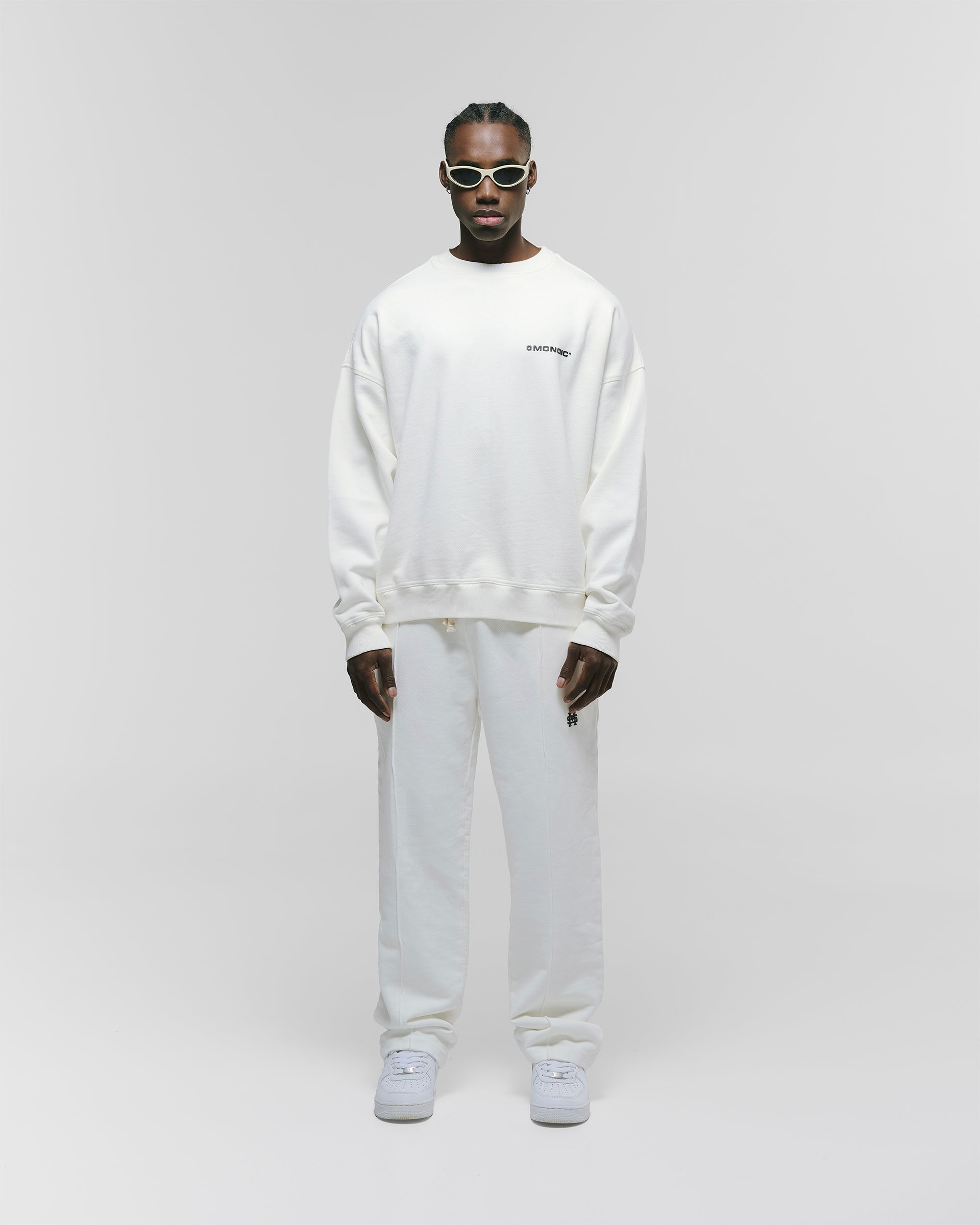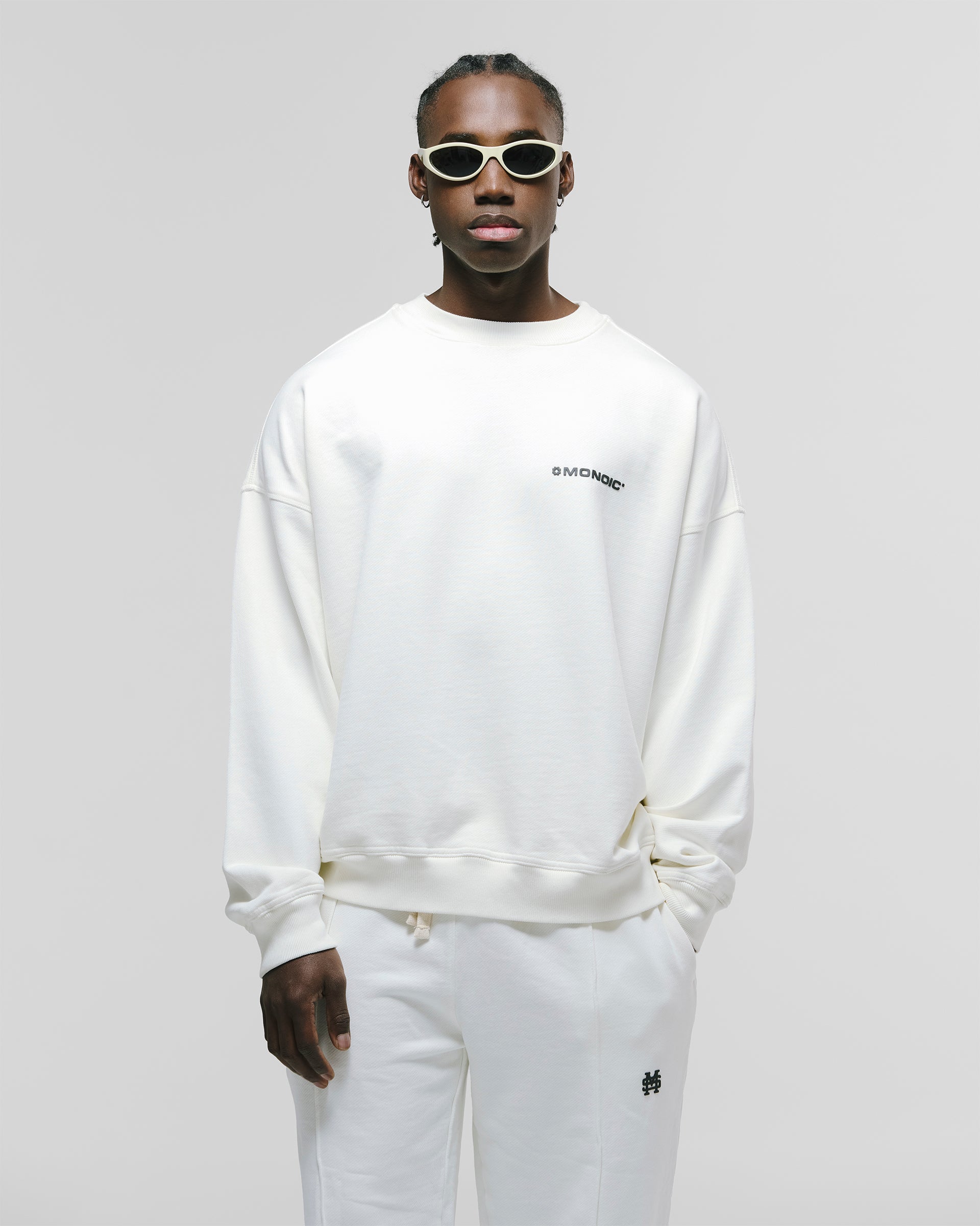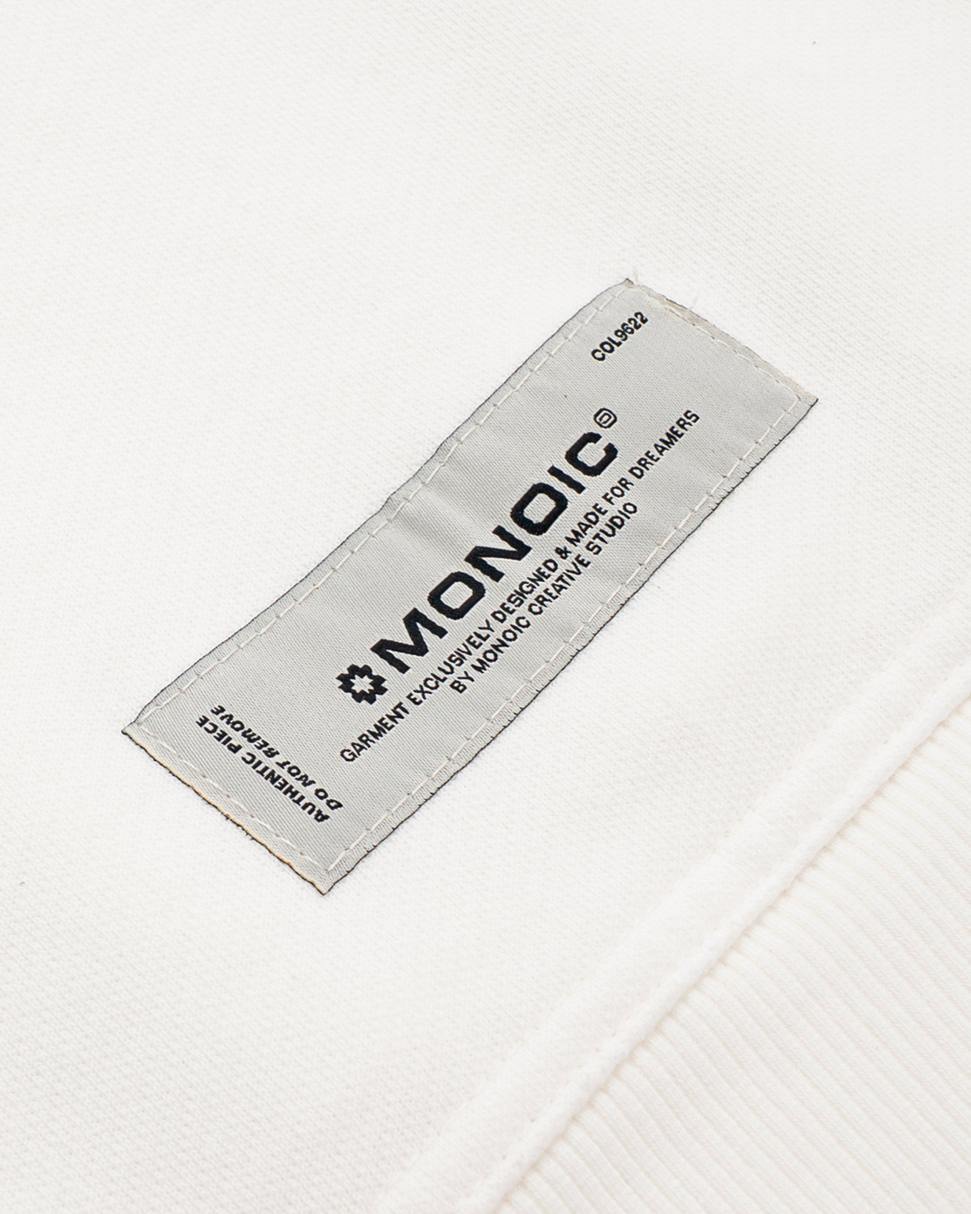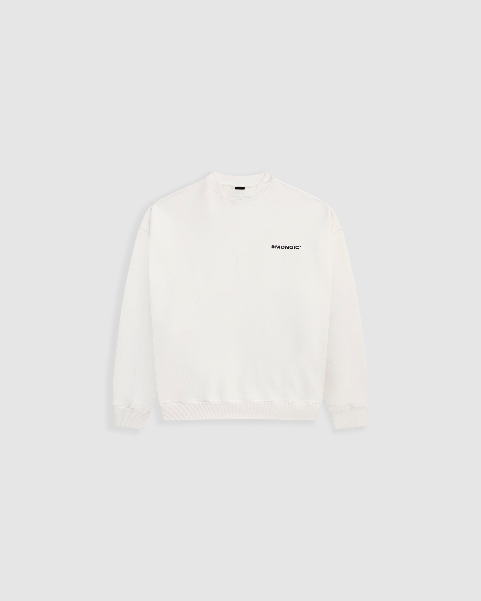 Crewneck Oversized Básico V3 en color Off White (Egret), confeccionado en burda sin perchar de 100% algodón (400 gsm) con oversized fit. Cuello redondo, puños y cintura en rib. Logo “MONOIC” en serigrafía de alto relieve en el pectoral izquierdo.