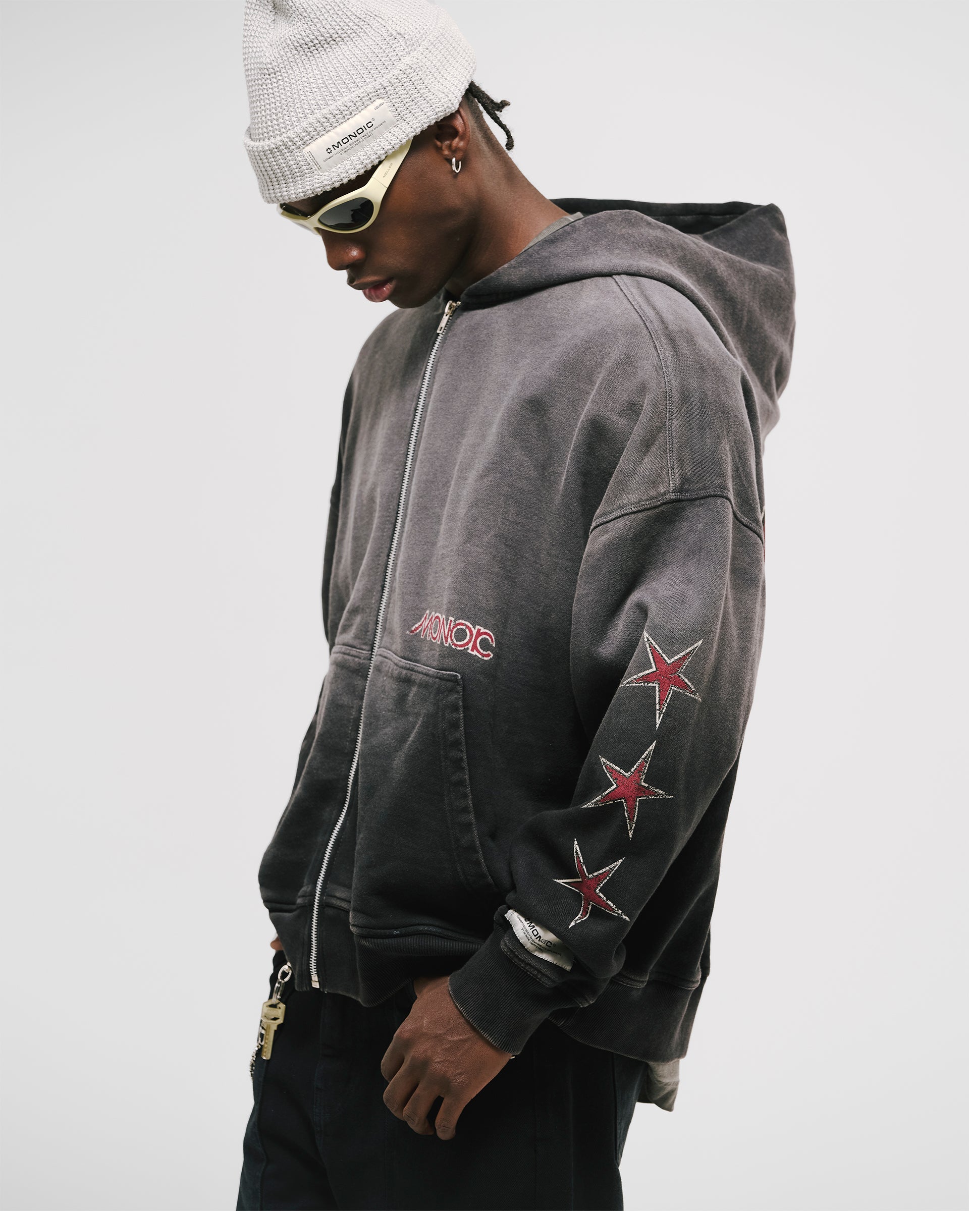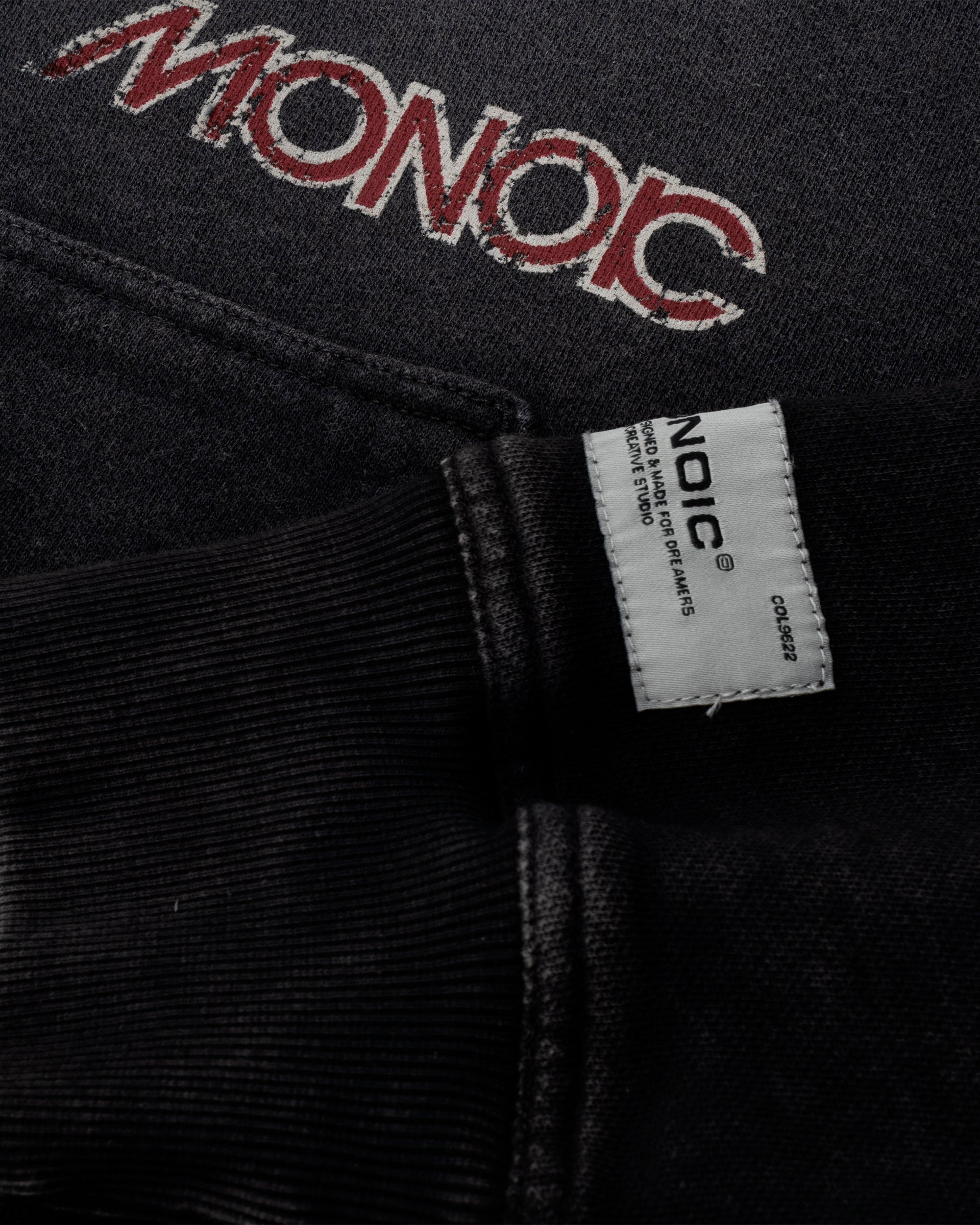 Zip hoodie en algodón 100% de alto gramaje (410 gsm) con cremallera YKK, color negro desgastado con efectos aplicados en aerosol para un look vintage. Gráficos “MONOIC RECORDS” en serigrafía sin tacto con desgastes: espalda, mangas y bajo la axila. Fit oversized. Marquilla MONOIC en el puño izquierdo. Hecho en Colombia.
