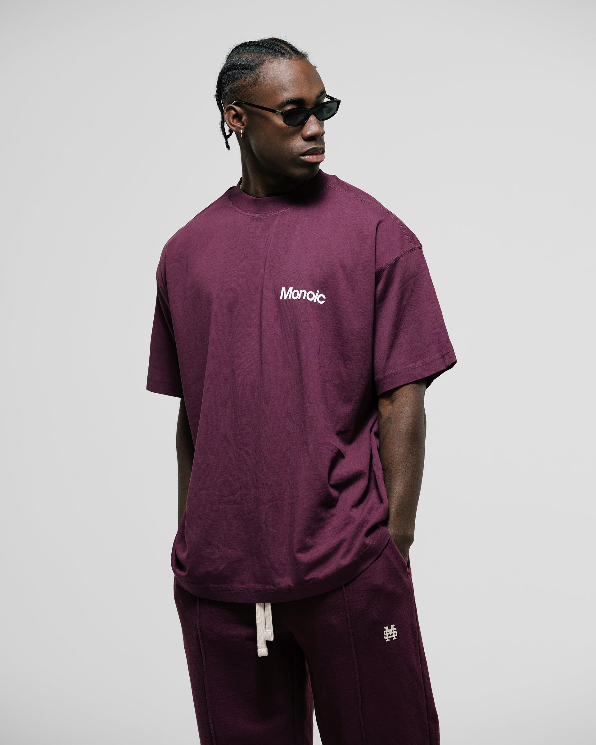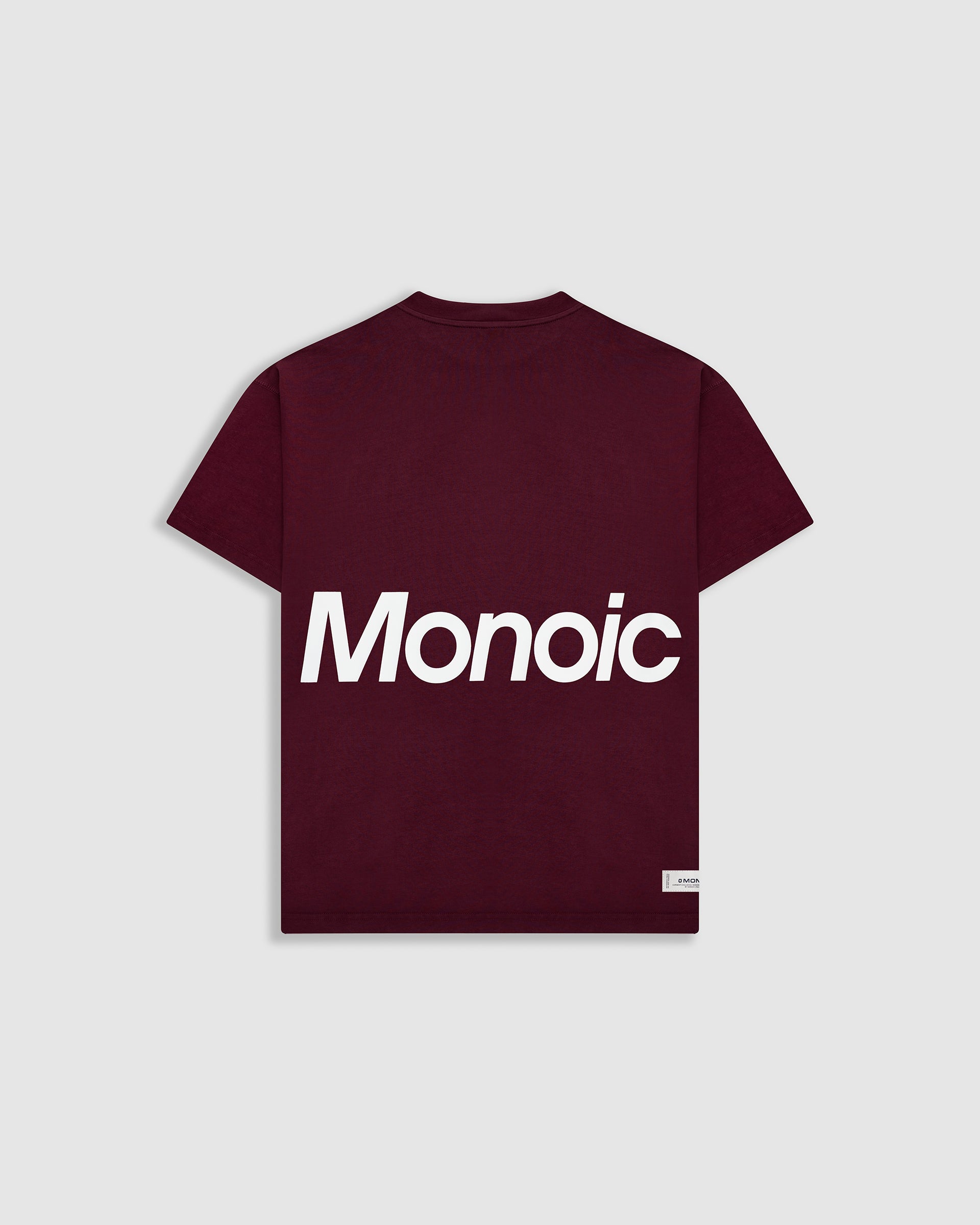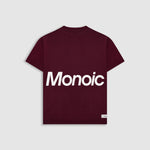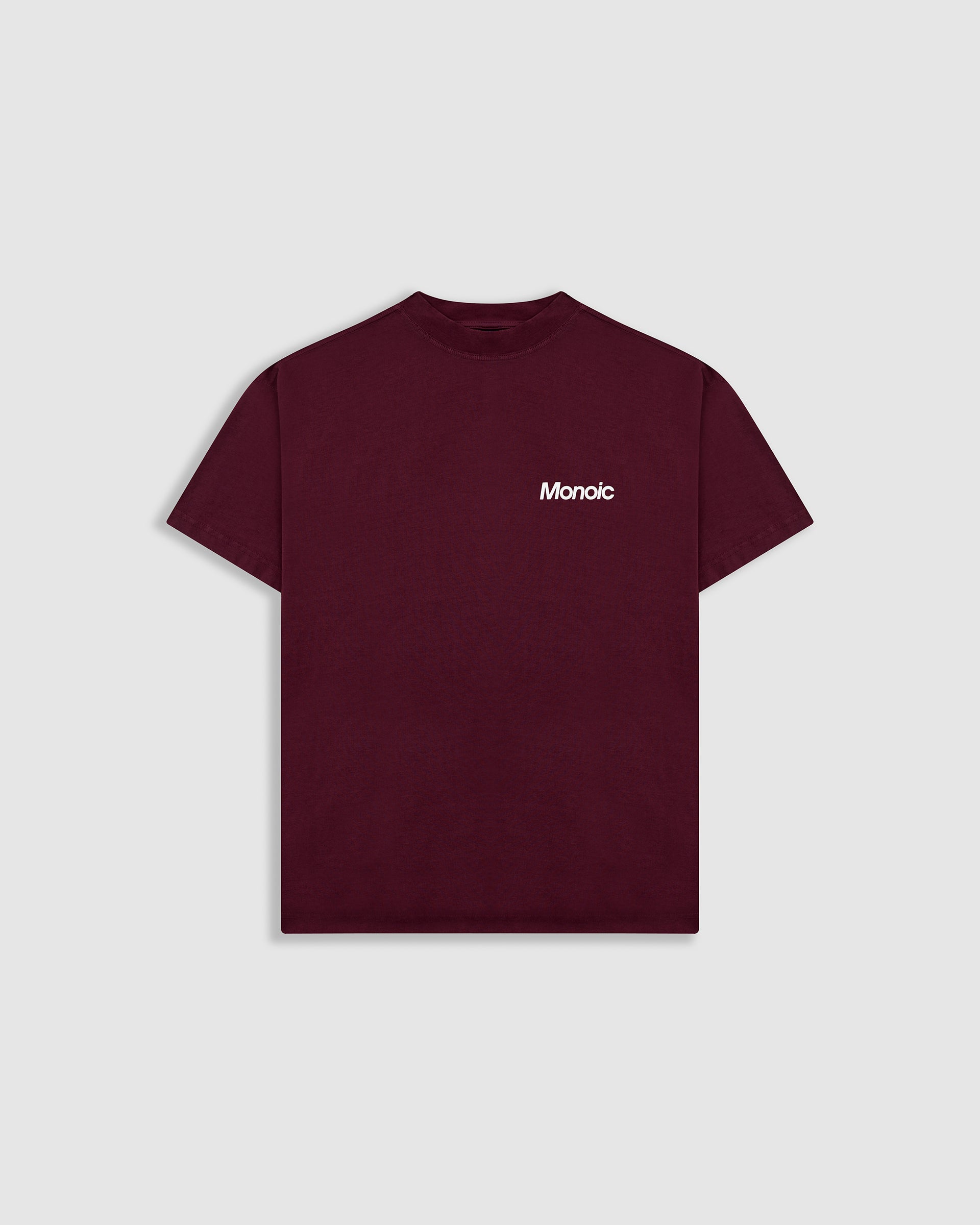 Camiseta de manga corta color Burgundy con oversized fit, hecha en jersey premium de 100% algodón (250 gsm). Cuello redondo en rib y logo “Monoic” estampado en la espalda. Hecha en Colombia.