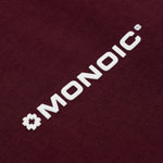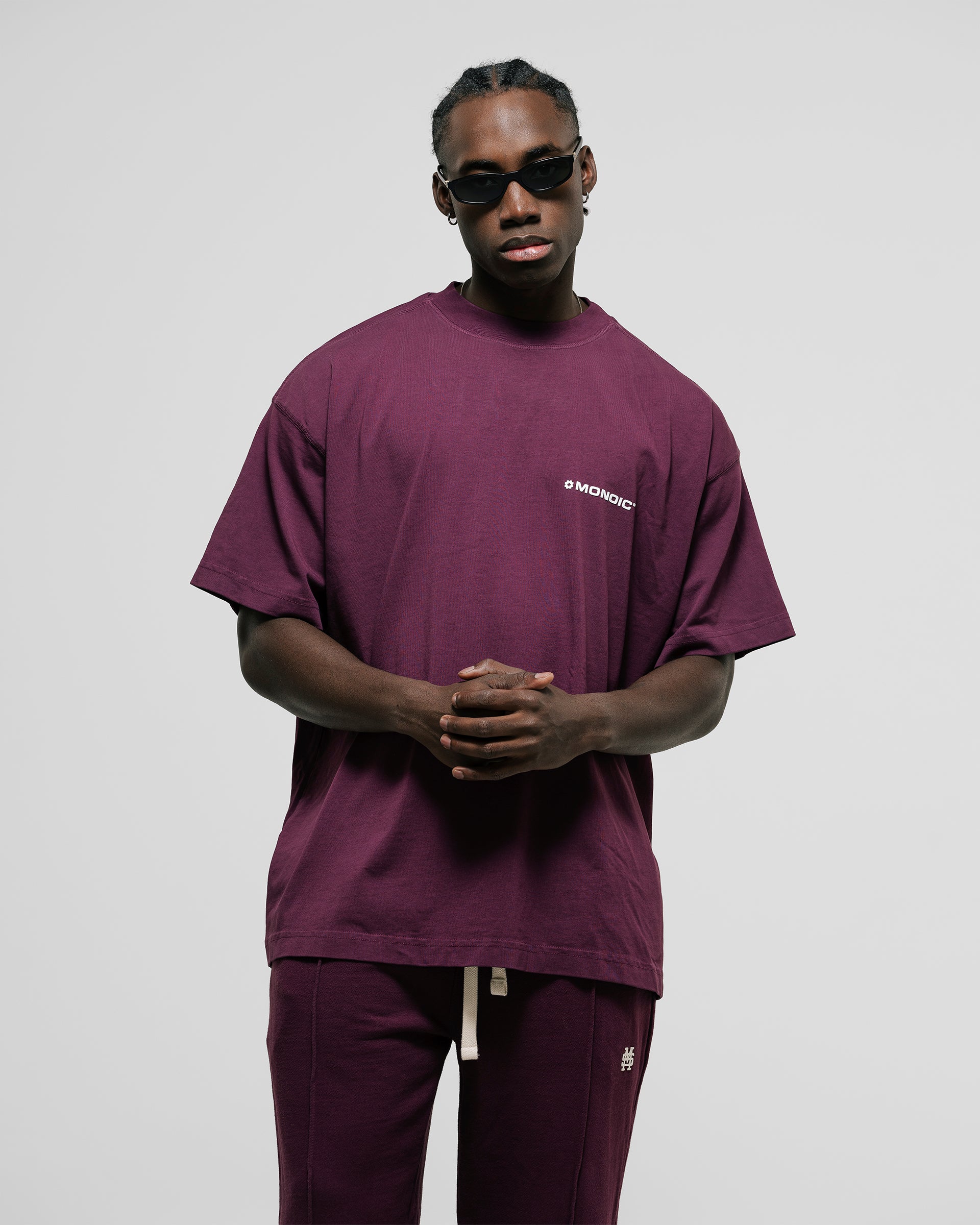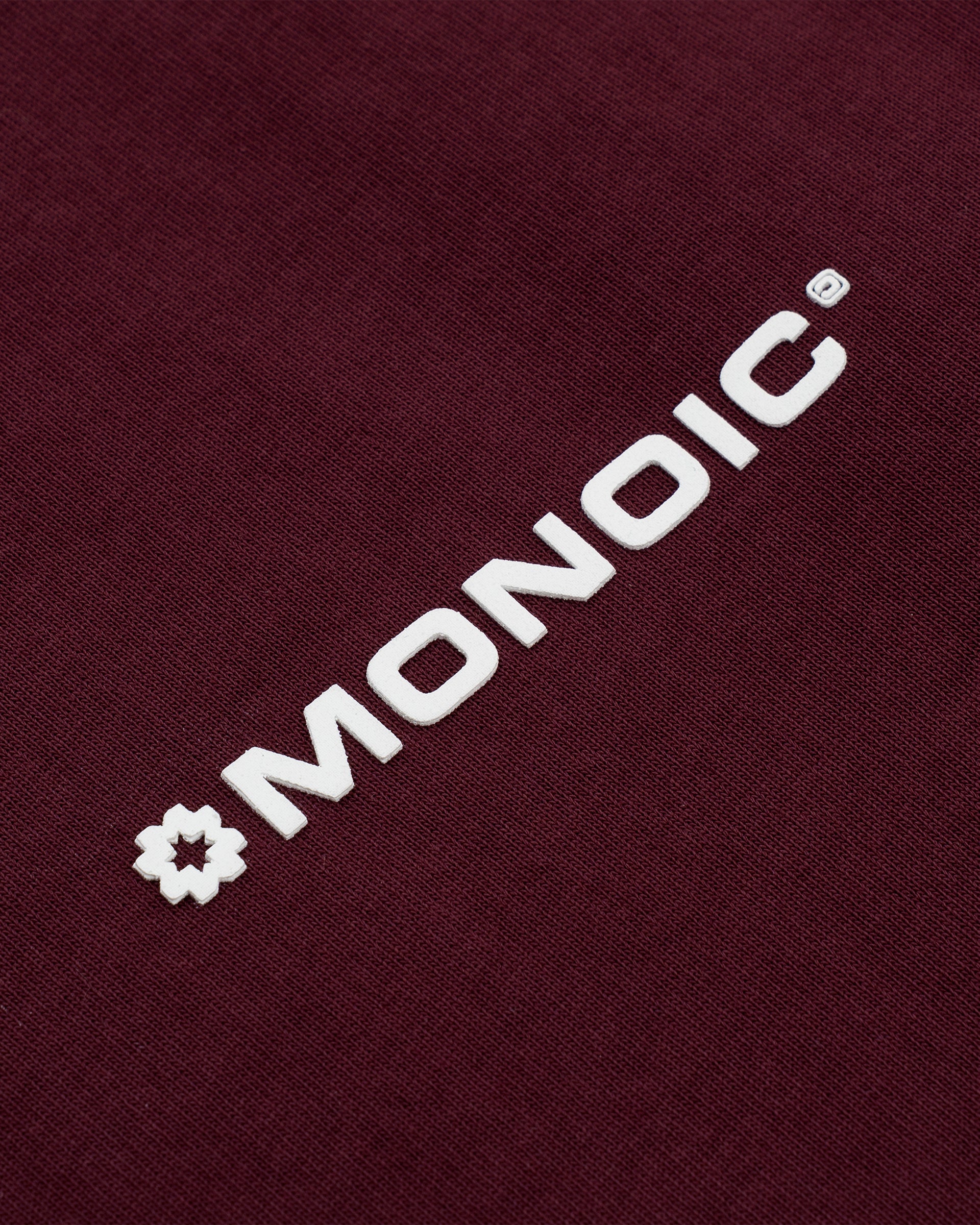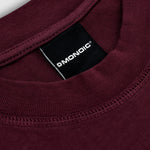 Camiseta oversized color Burgundy o Cherry, confeccionada en jersey premium de 100% algodón de alto gramaje (250 gsm). Cuello redondo en rib. Logo MONOIC en serigrafía de alto relieve (puff 3D) en el pectoral izquierdo y monograma en alto relieve centrado en el cuello trasero. Hecha en Colombia.