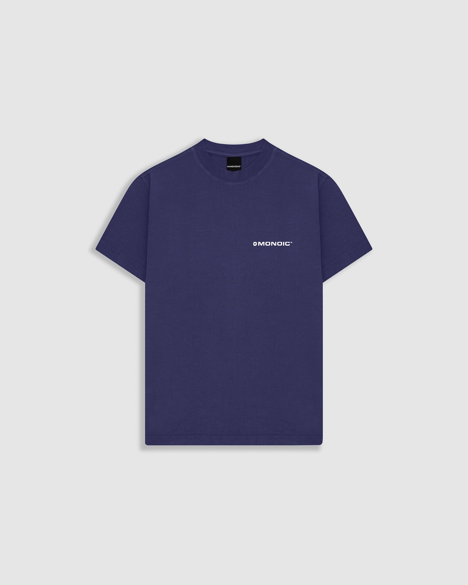 Camiseta de manga corta color Lavanda (Skipper Blue) con regular fit, hecha en jersey premium de 100% algodón de alto gramaje (250 gsm). Cuello redondo en rib y logo MONOIC en serigrafía de alto relieve (puff 3D) en el pectoral izquierdo. Hecha en Colombia.