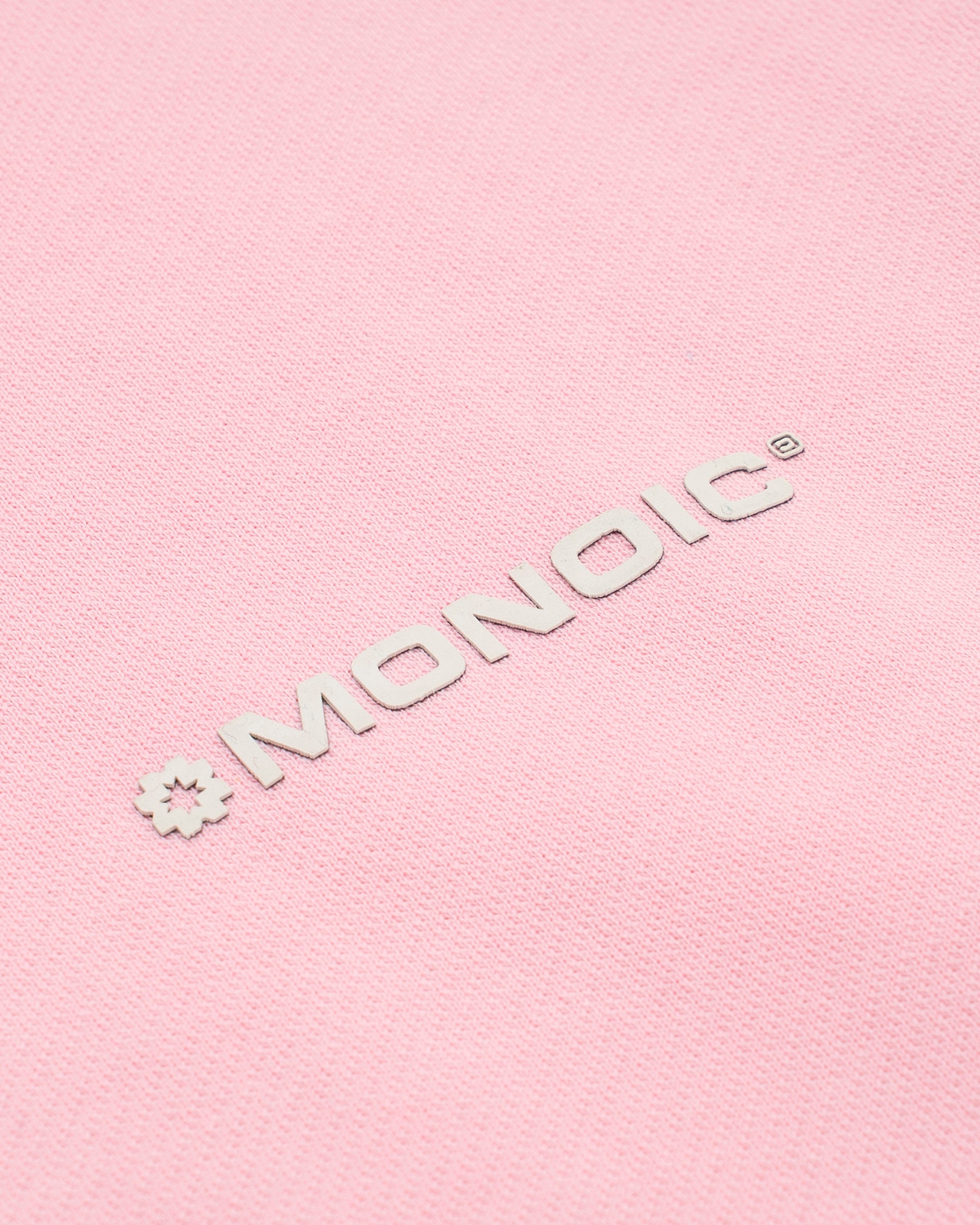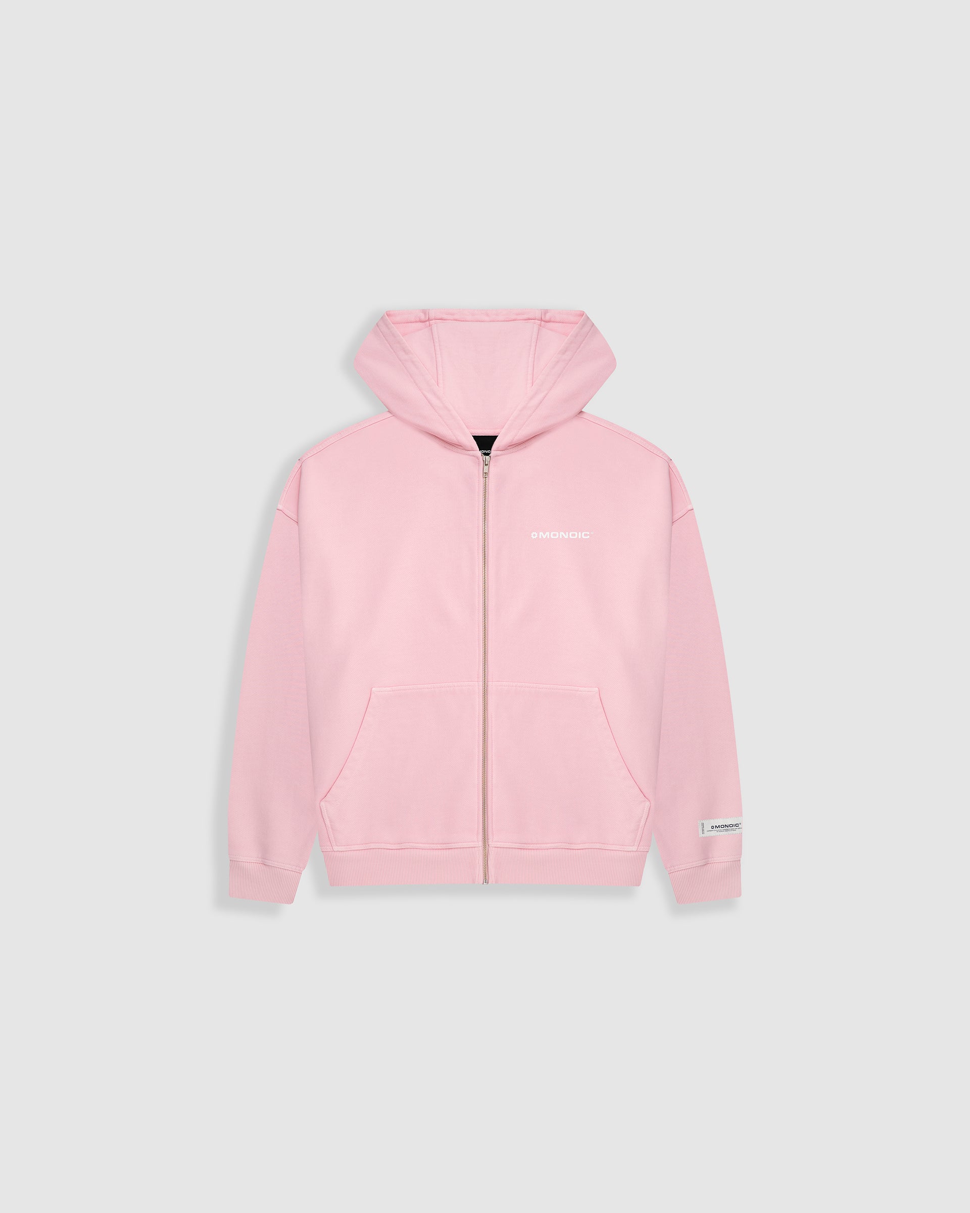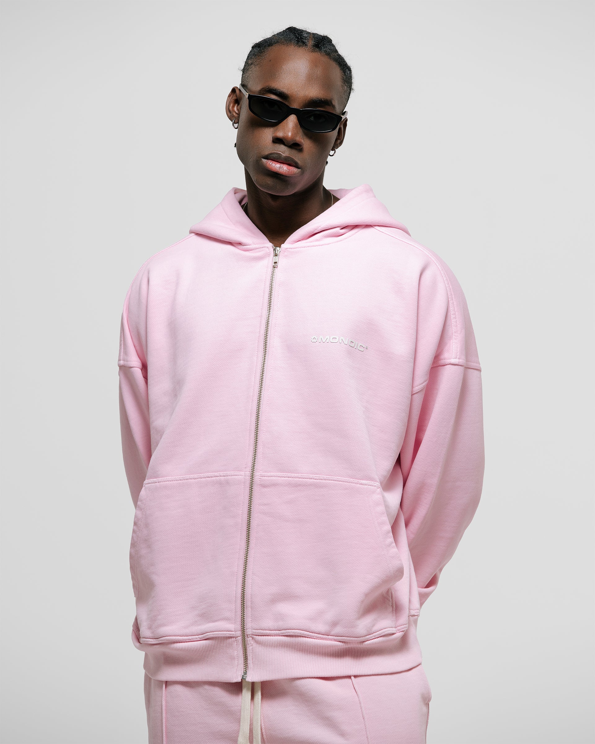Zip Hoodie Oversized Básico V3 color Rosado Pastel, 100% algodón (400 gsm). Pre-encogido y teñido en prenda. Cremallera frontal YKK #5, bolsillos laterales, capota y rib en puños y cintura. Logo “Monoic” en serigrafía en pecho izquierdo.