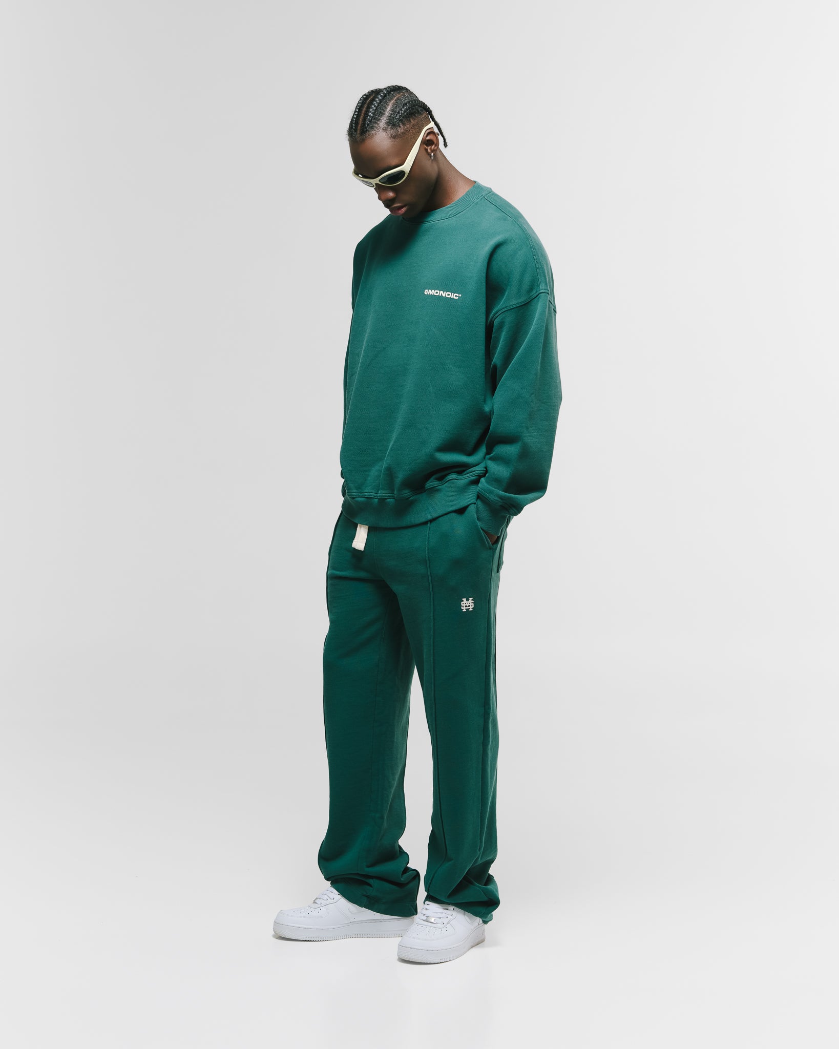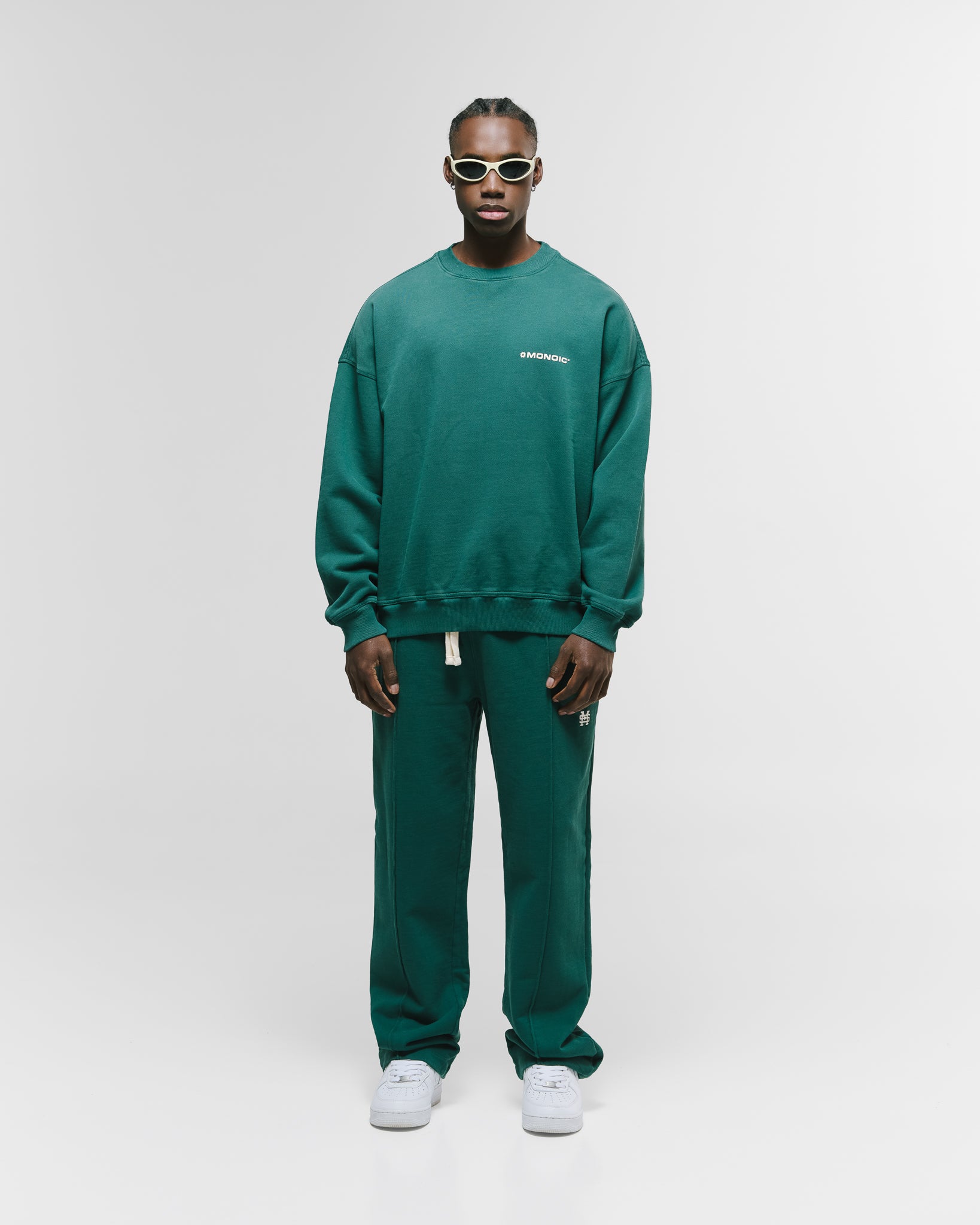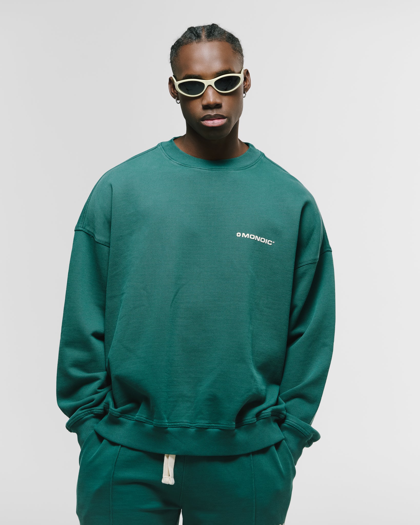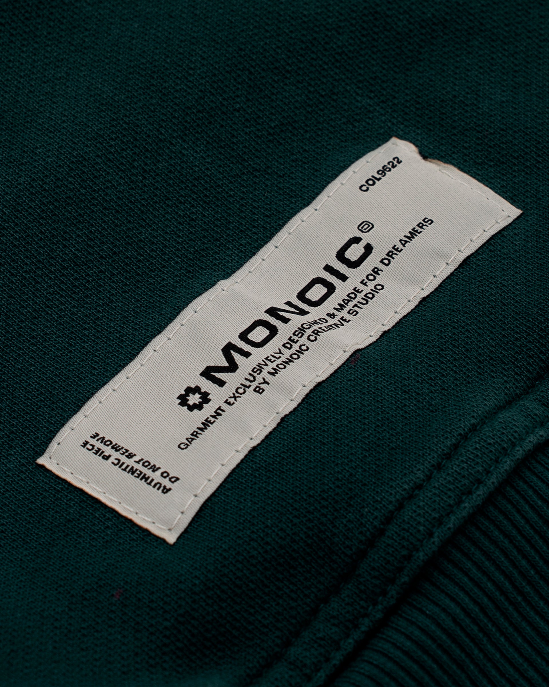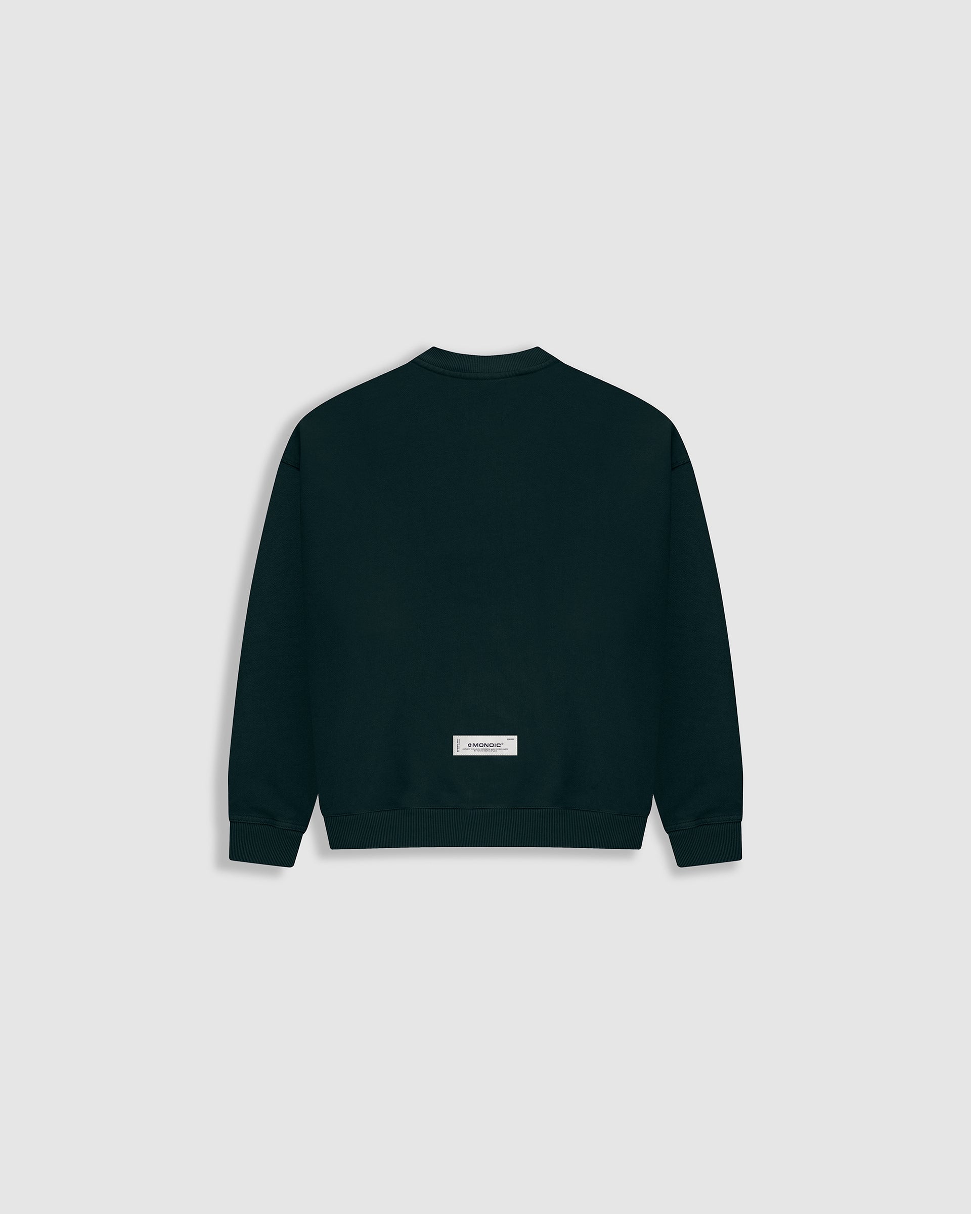 Crewneck oversized color Forest Green, confeccionado en burda sin perchar de 100% algodón (400 gsm) con oversized fit. Cuello redondo, puños y cintura en rib. Logo MONOIC en serigrafía de alto relieve en el pectoral izquierdo. Hecho en Colombia.