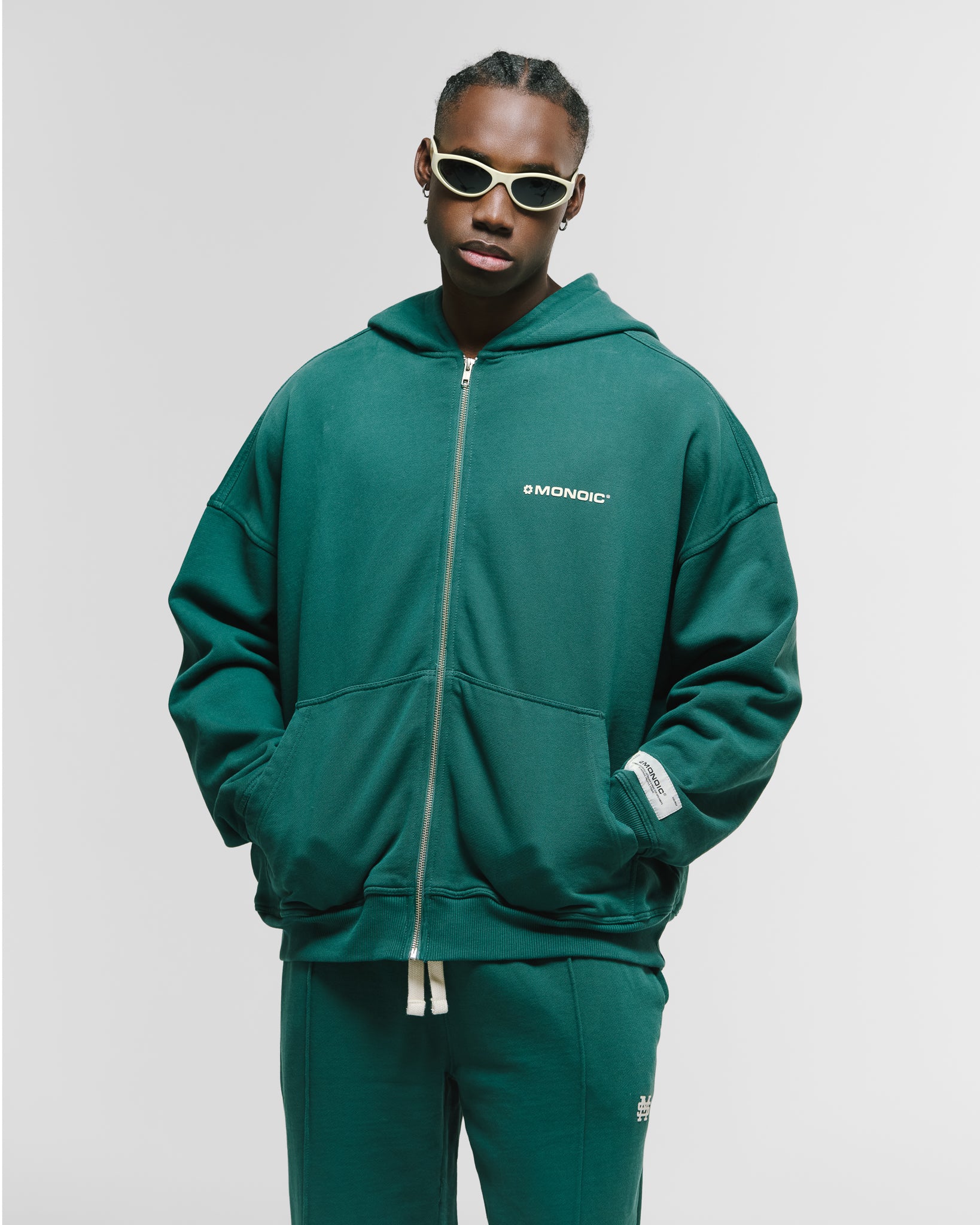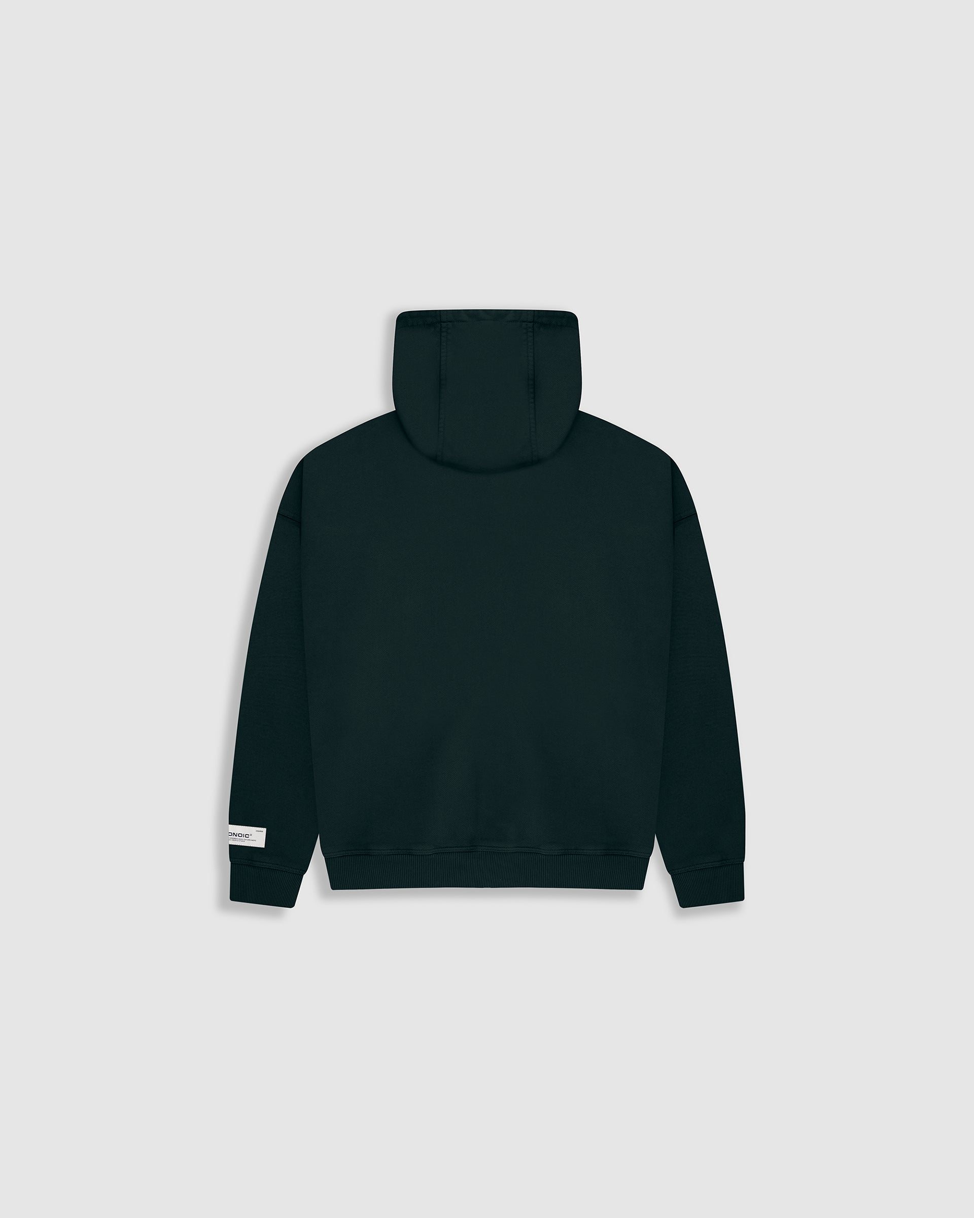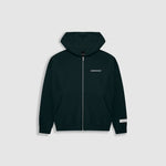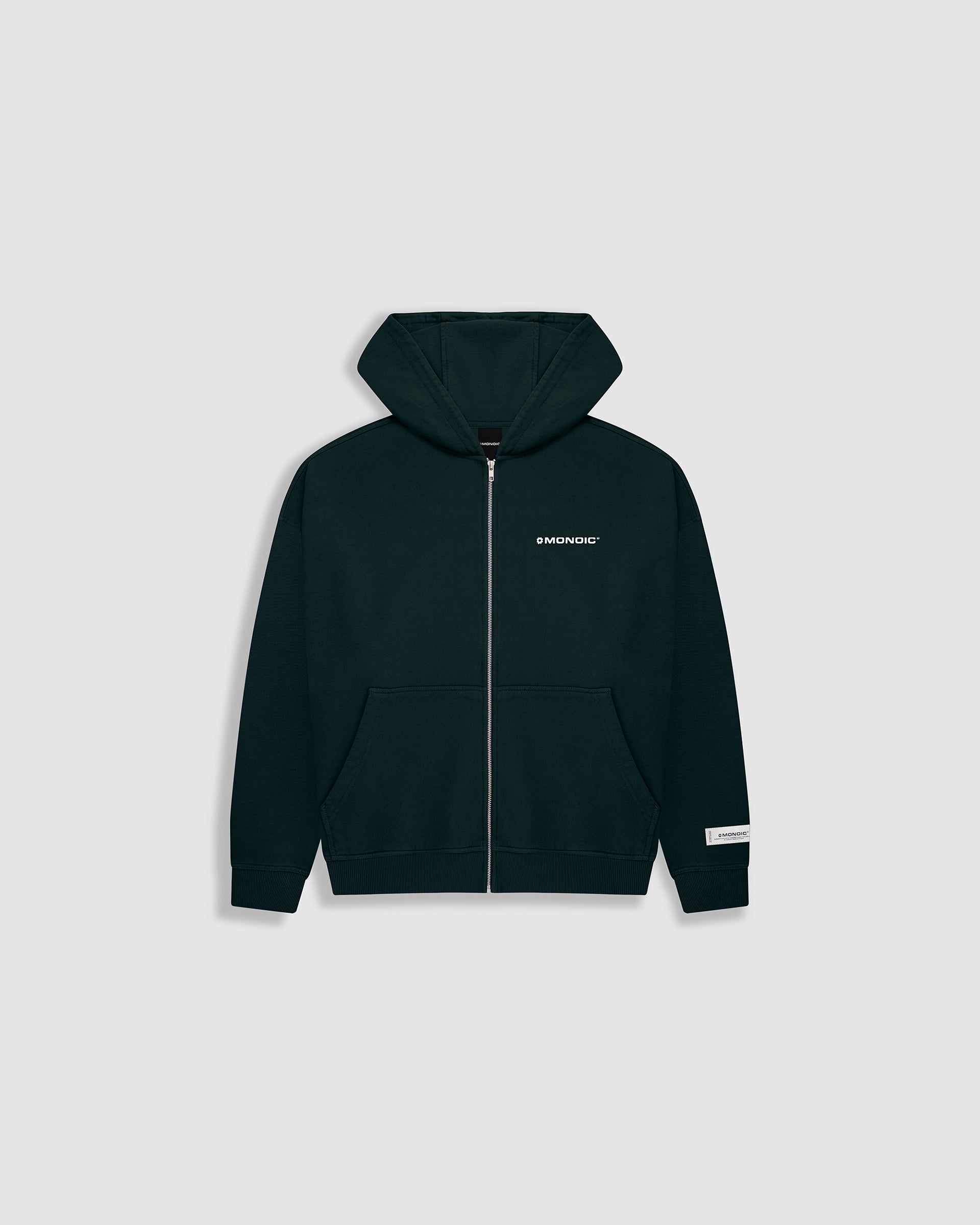 Zip Hoodie oversized color Forest Green, confeccionado en 100% algodón de alto gramaje (400 gsm). Pre-encogido y teñido en prenda para una terminación superior. Cremallera frontal YKK #5, bolsillos laterales, capota y rib en puños y cintura. Logo MONOIC en serigrafía en el pectoral izquierdo. Hecho en Colombia.