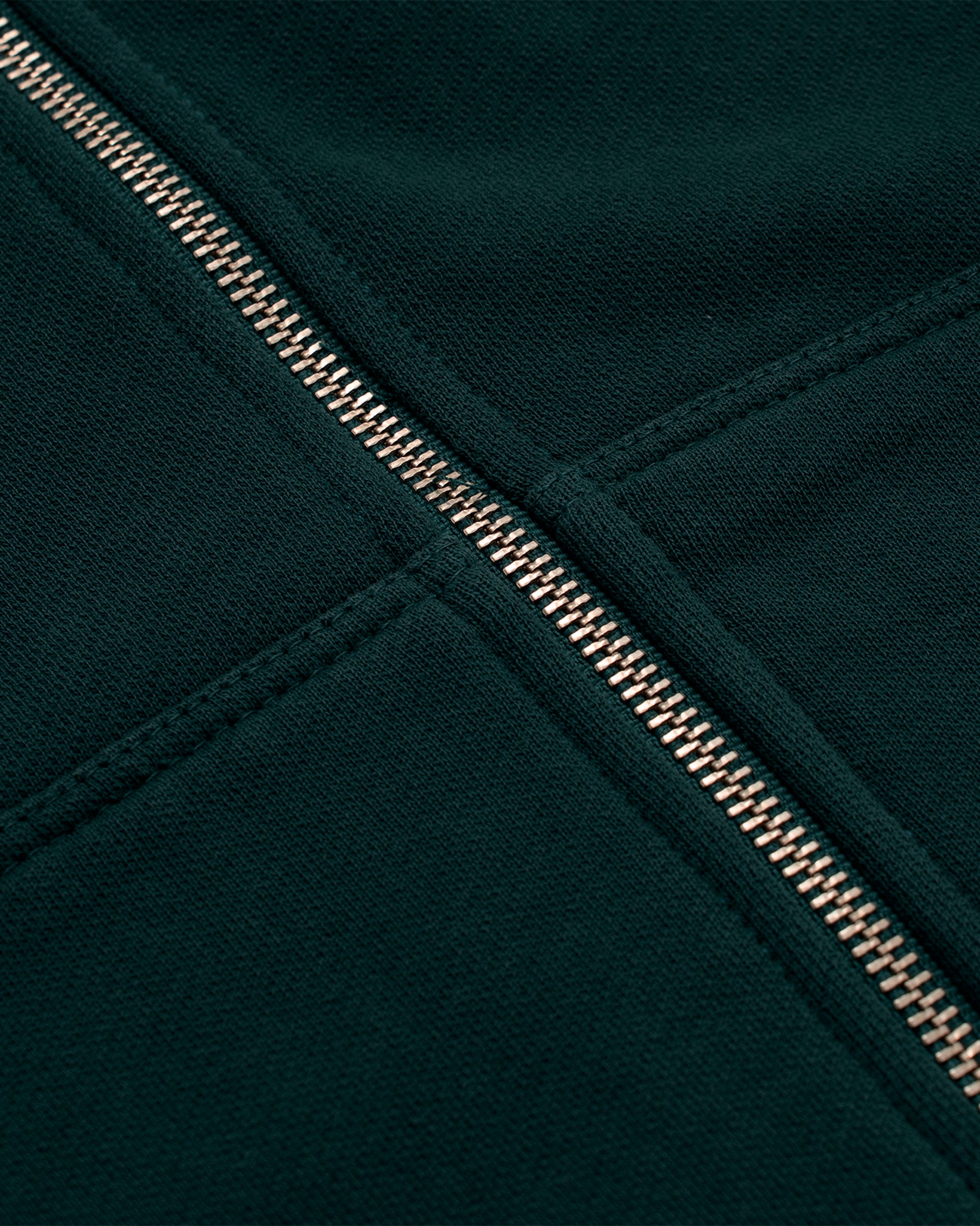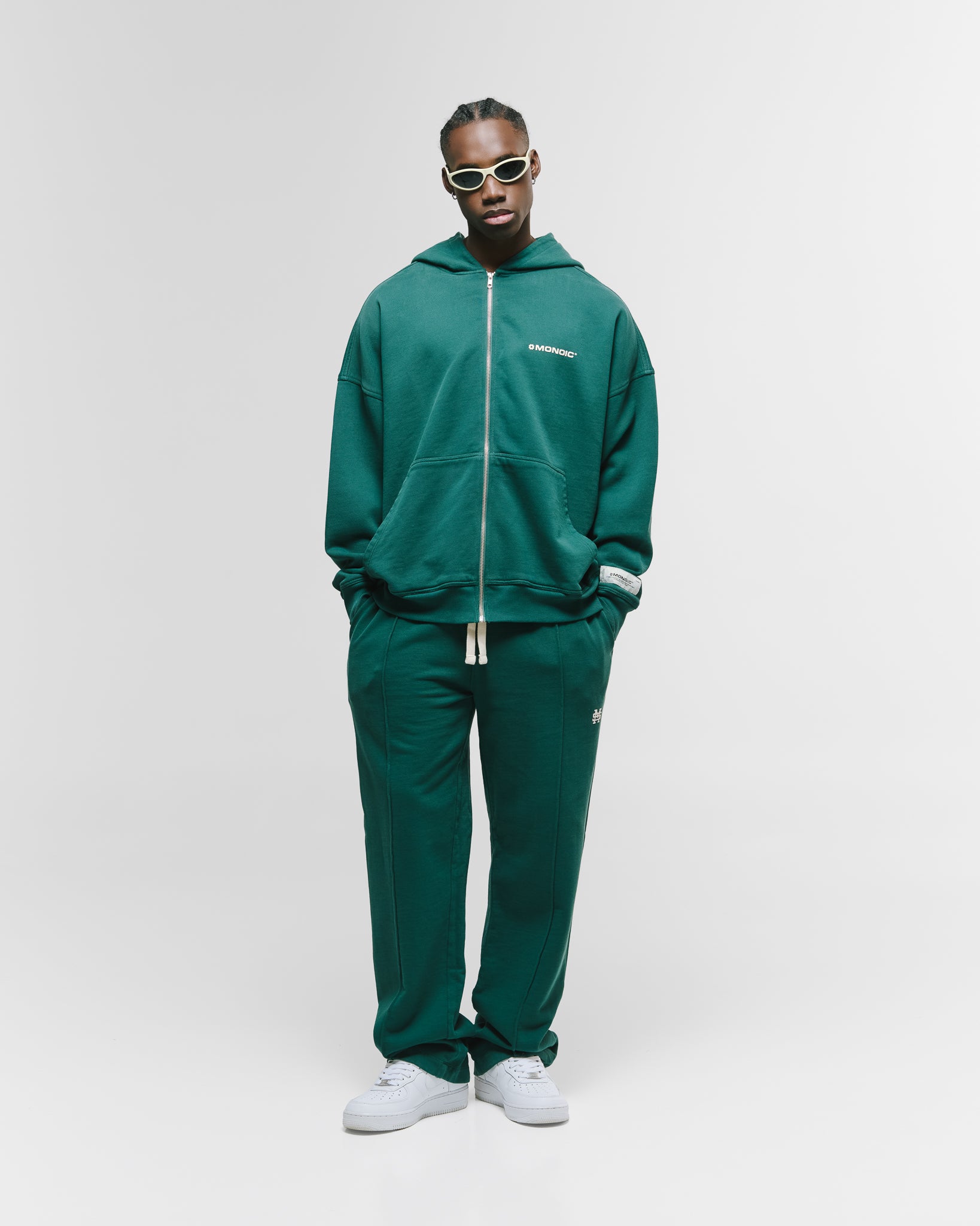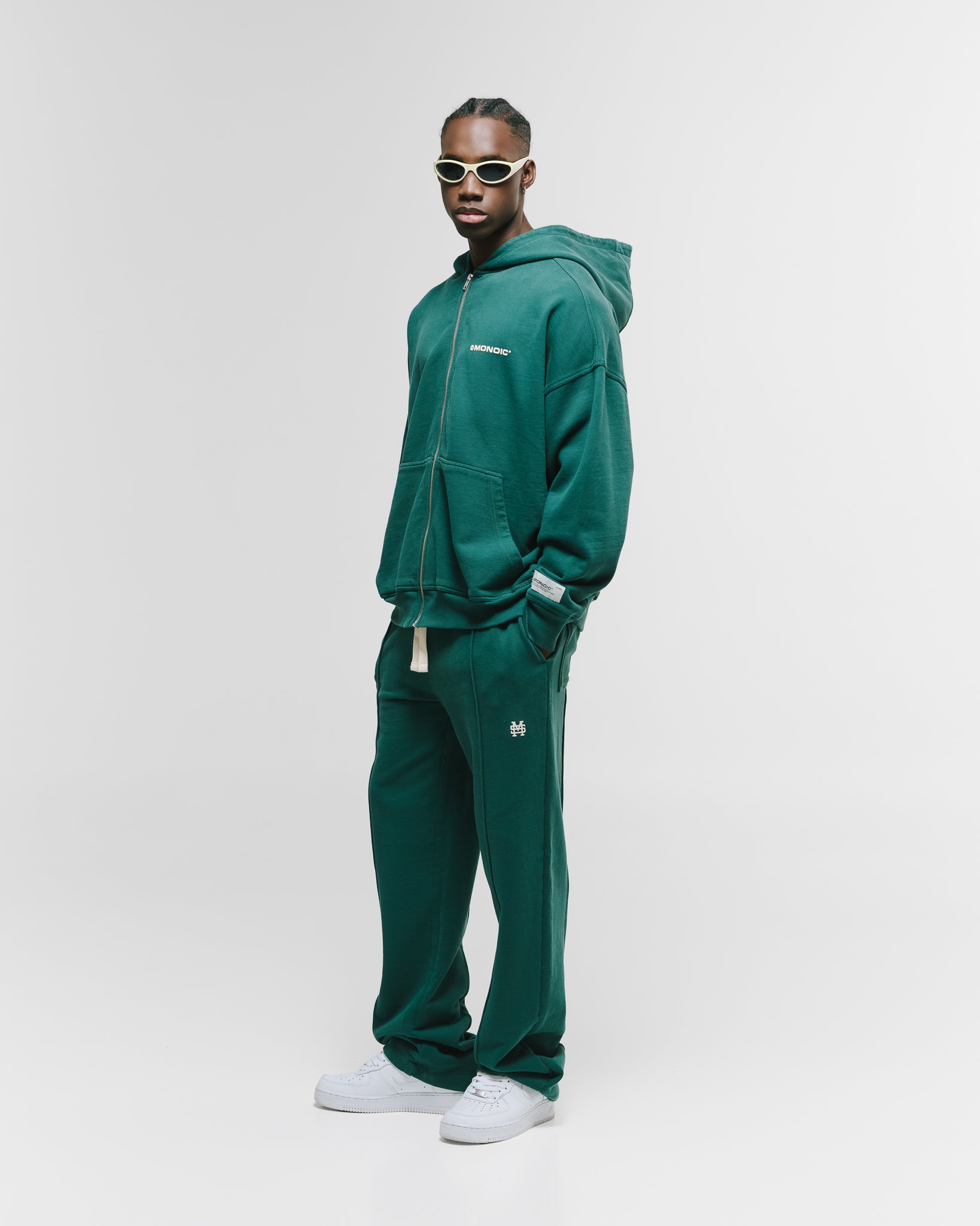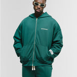 Zip Hoodie oversized color Forest Green, confeccionado en 100% algodón de alto gramaje (400 gsm). Pre-encogido y teñido en prenda para una terminación superior. Cremallera frontal YKK #5, bolsillos laterales, capota y rib en puños y cintura. Logo MONOIC en serigrafía en el pectoral izquierdo. Hecho en Colombia.