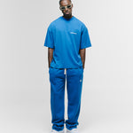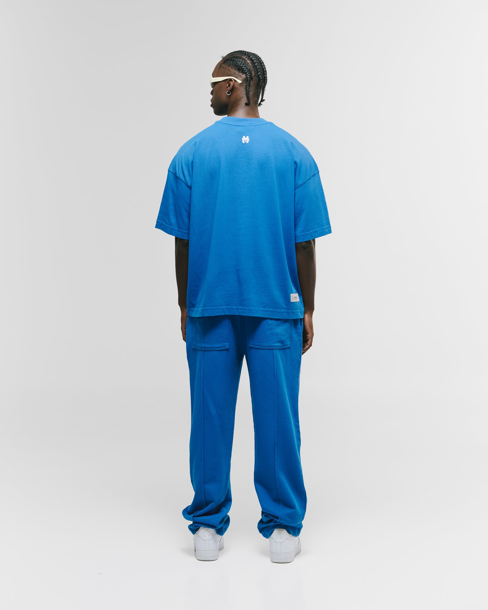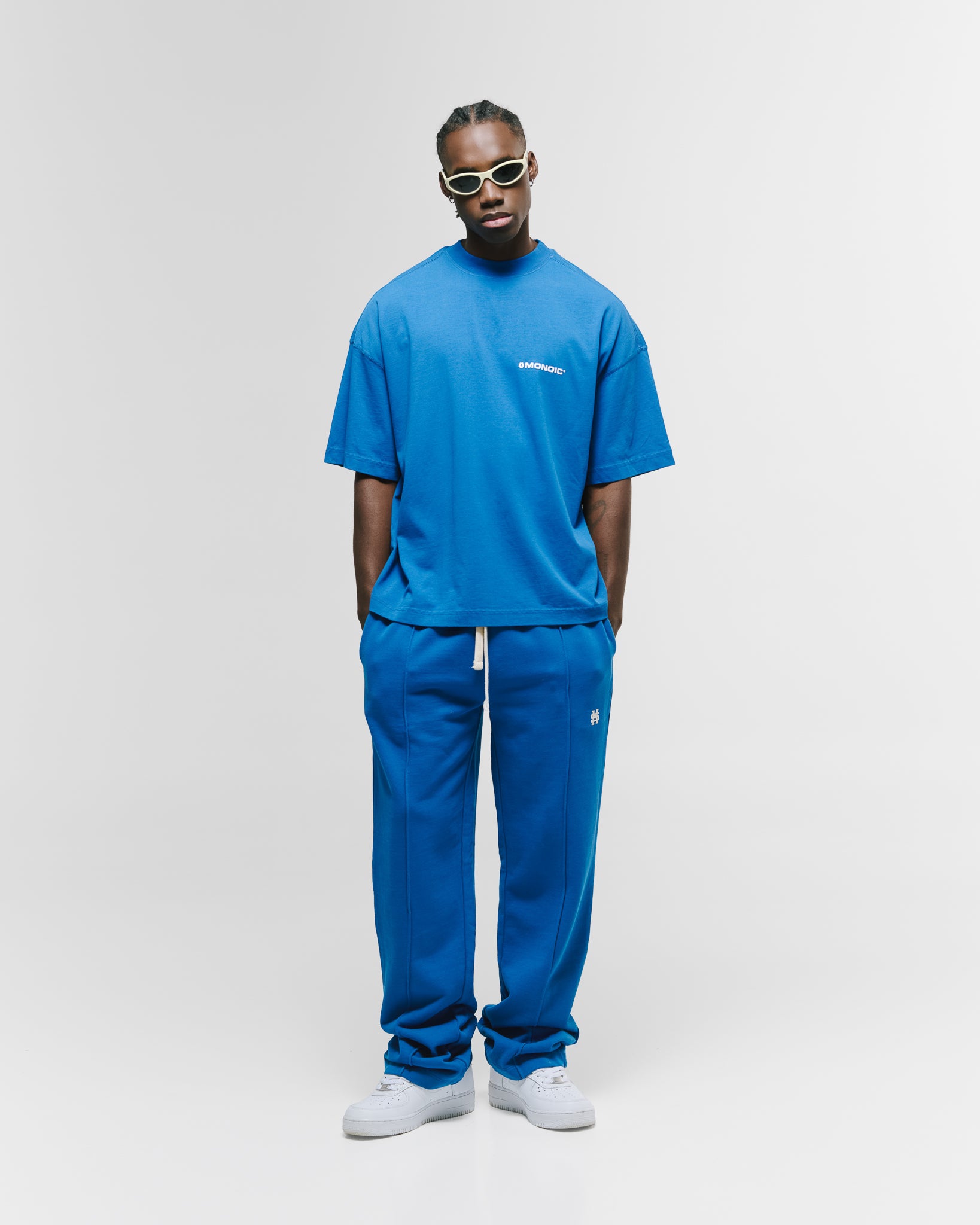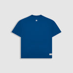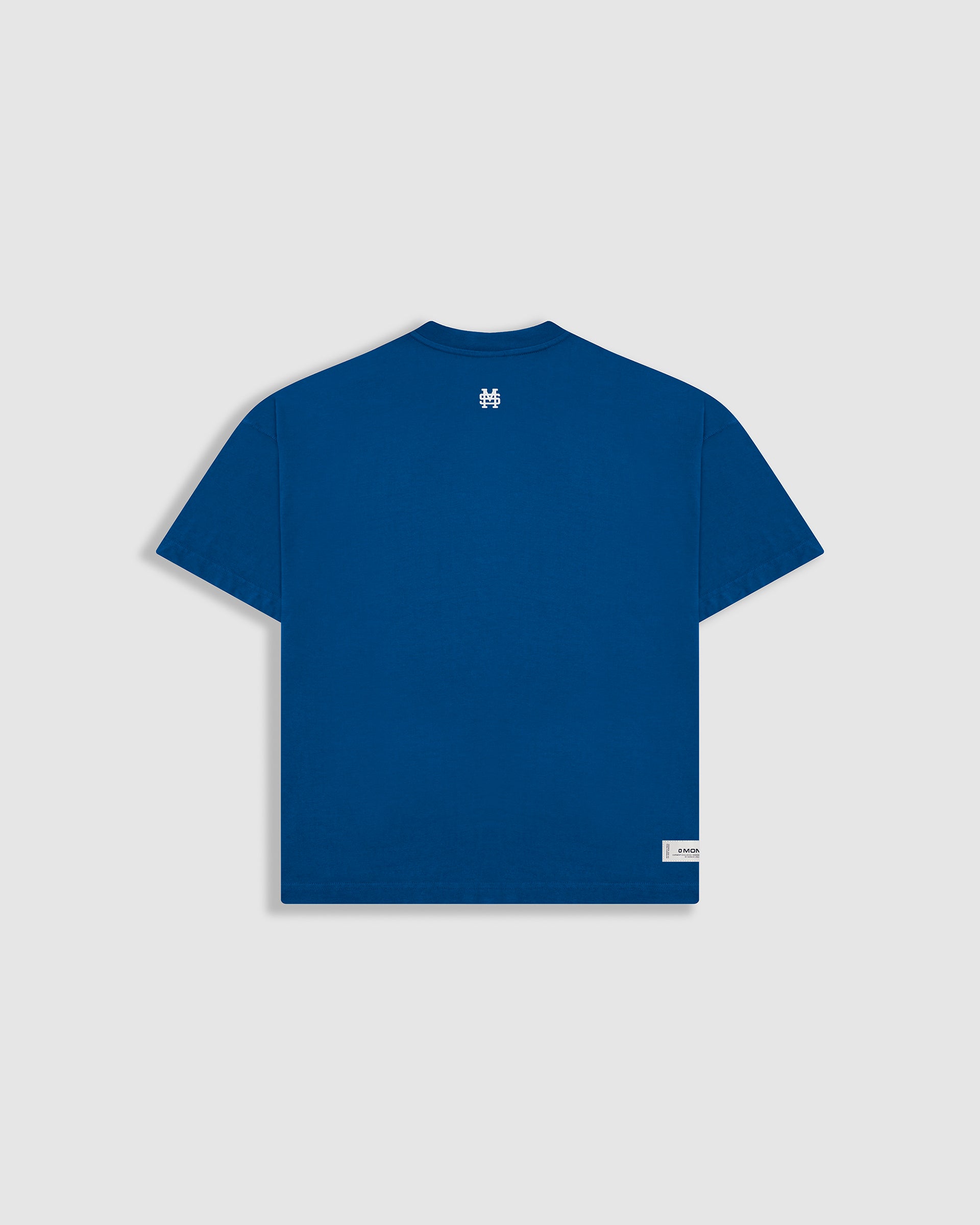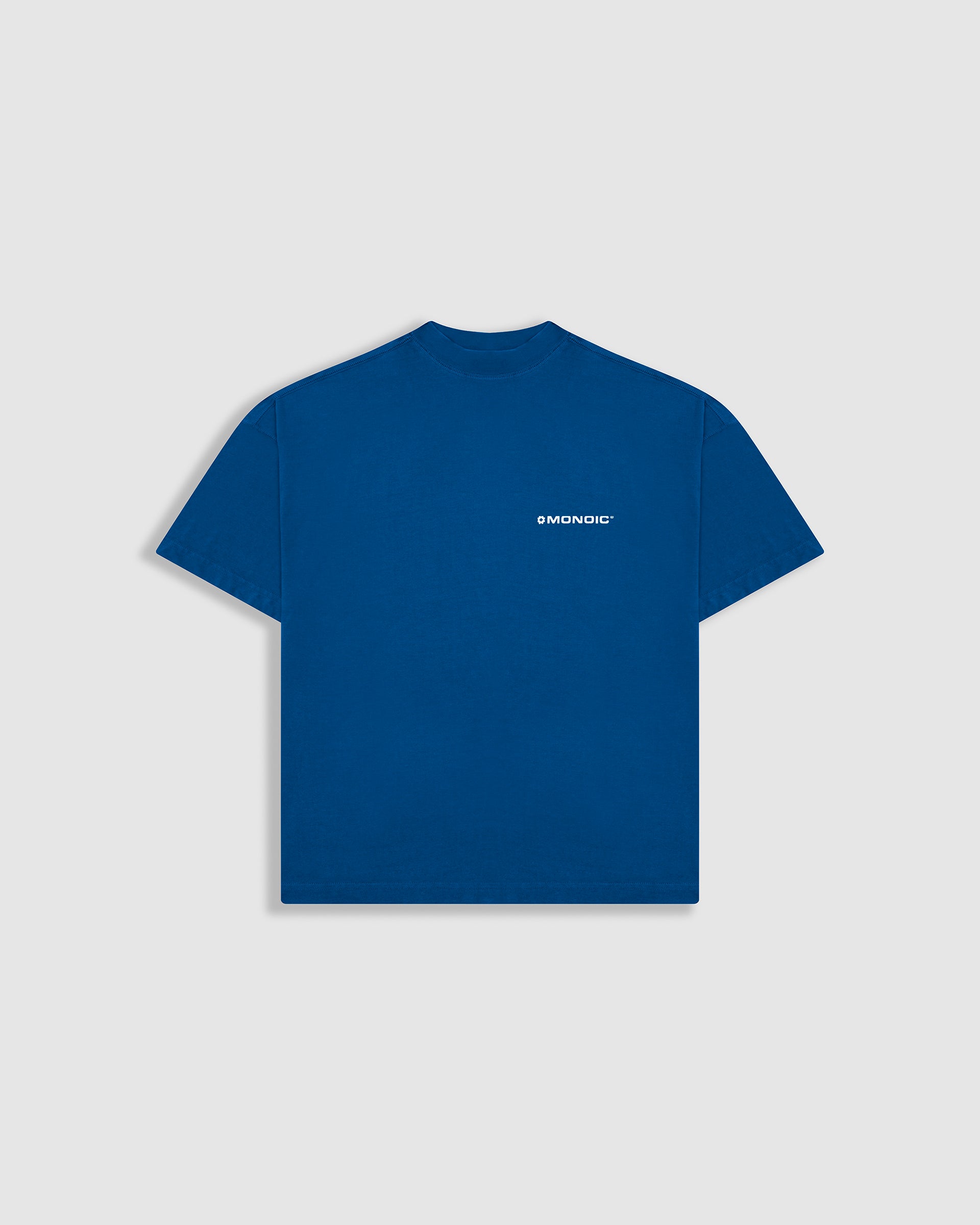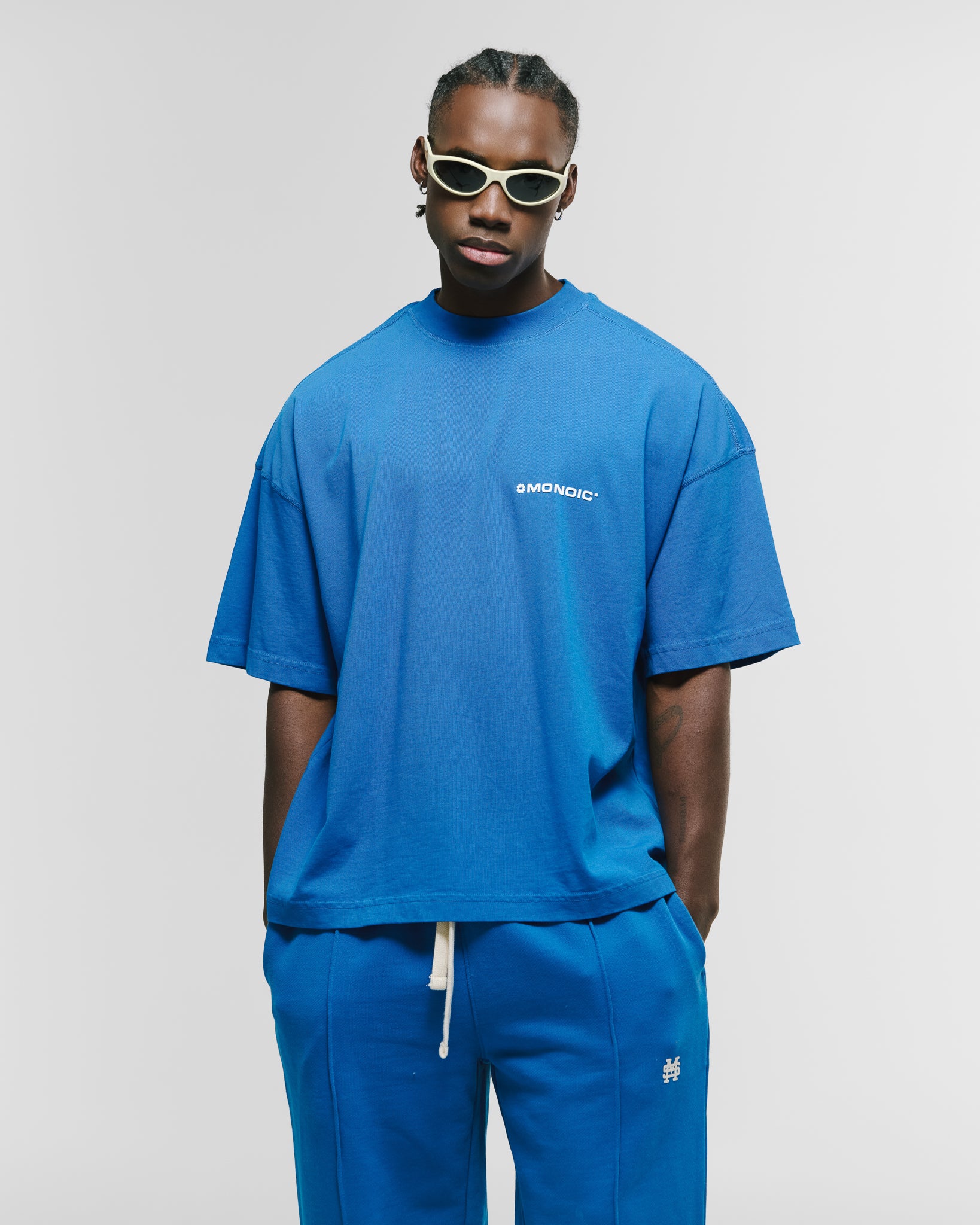 Camiseta boxy fit color Azul Cobalto, confeccionada en jersey premium de 100% algodón de alto gramaje (250 gsm). Cuello redondo en rib. Logo MONOIC en serigrafía de alto relieve en el pectoral izquierdo y monograma en alto relieve centrado en el cuello trasero. Hecha en Colombia.
