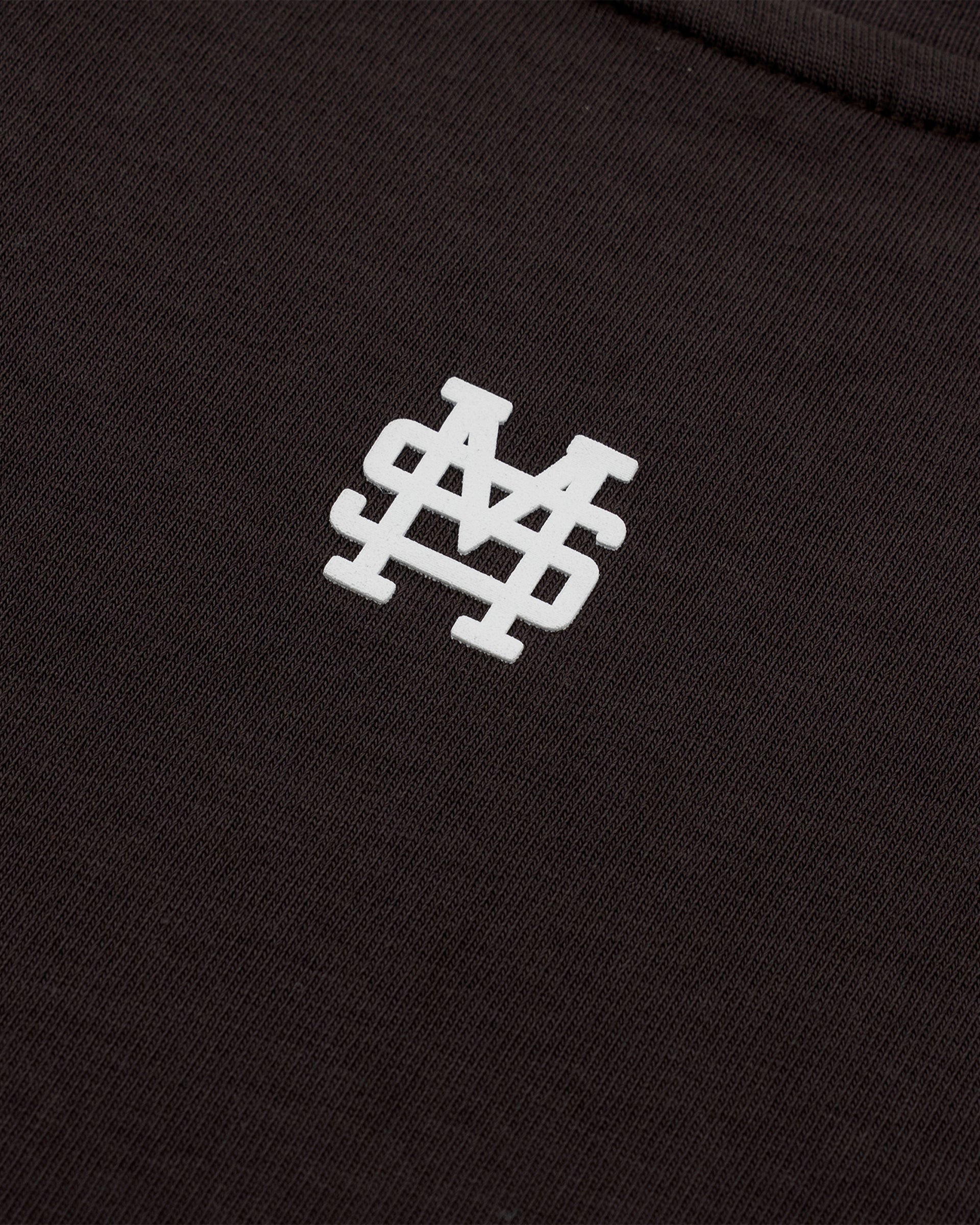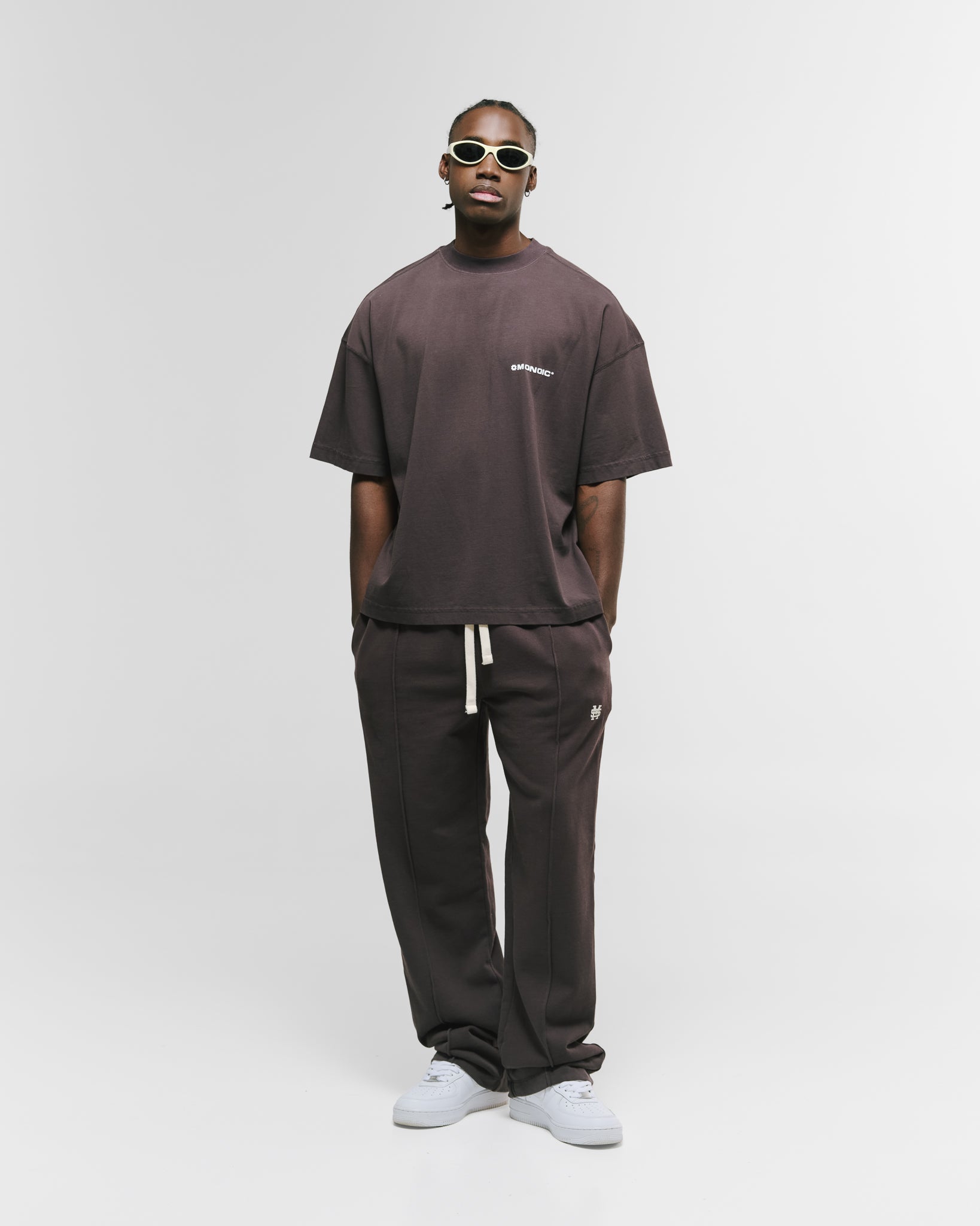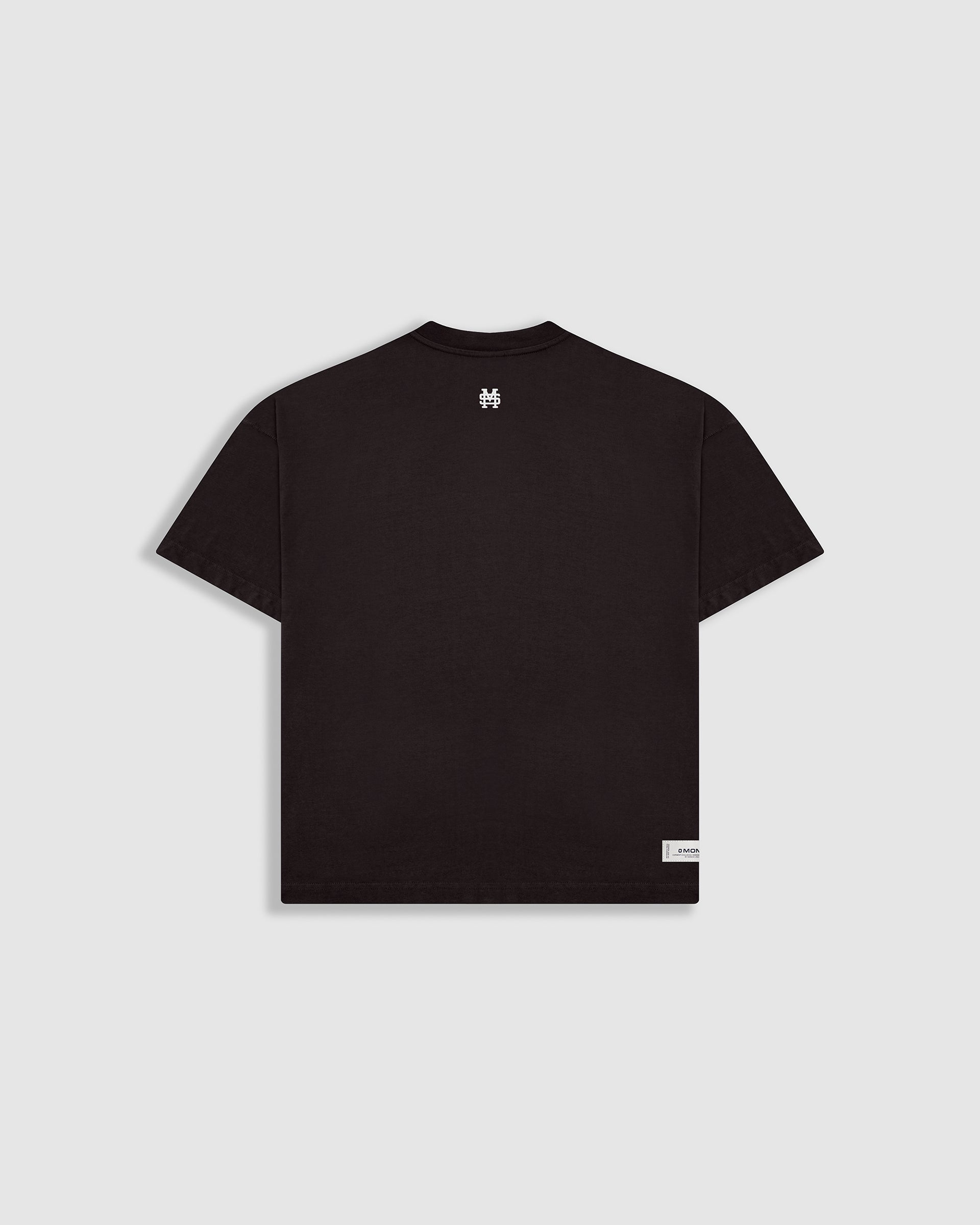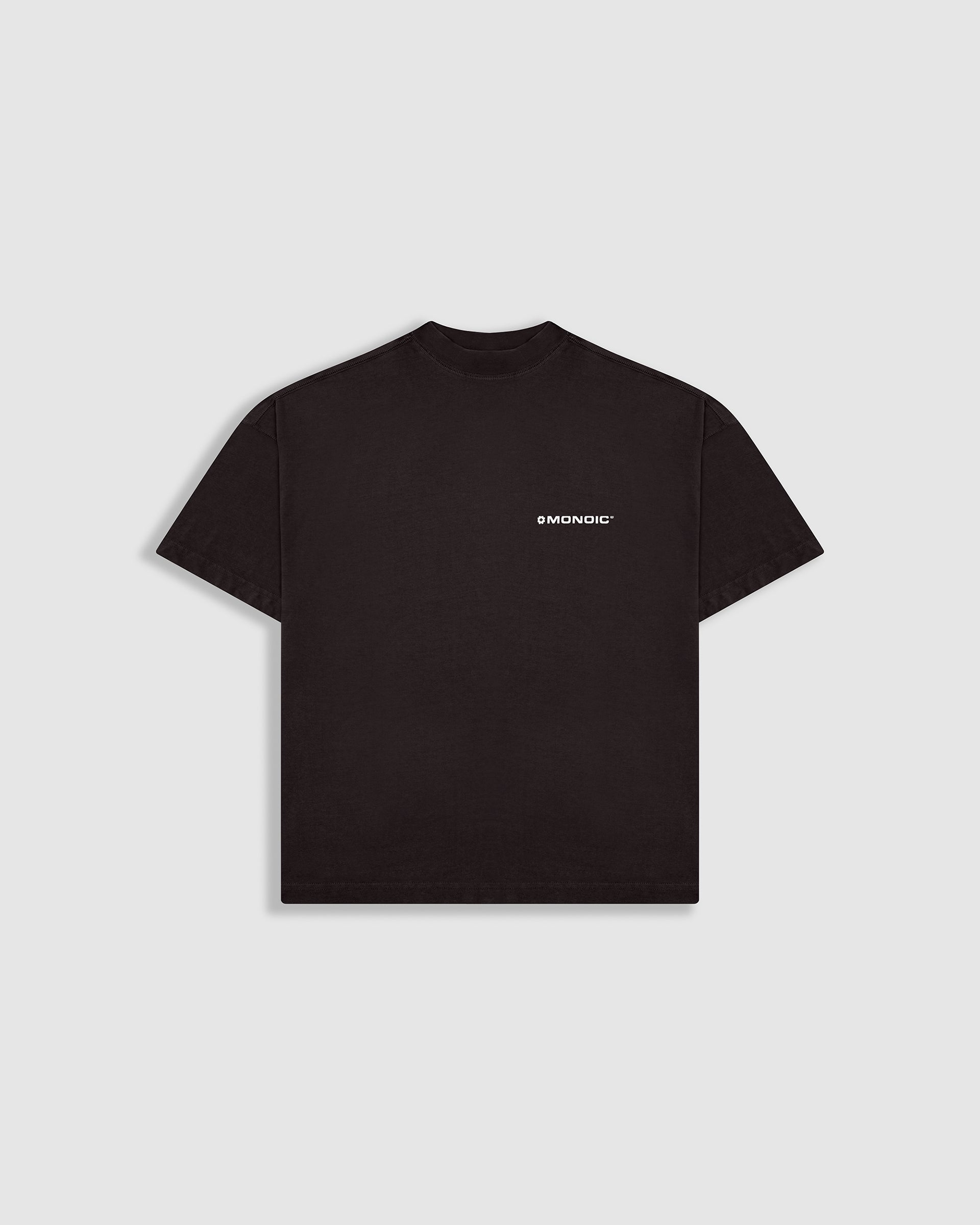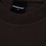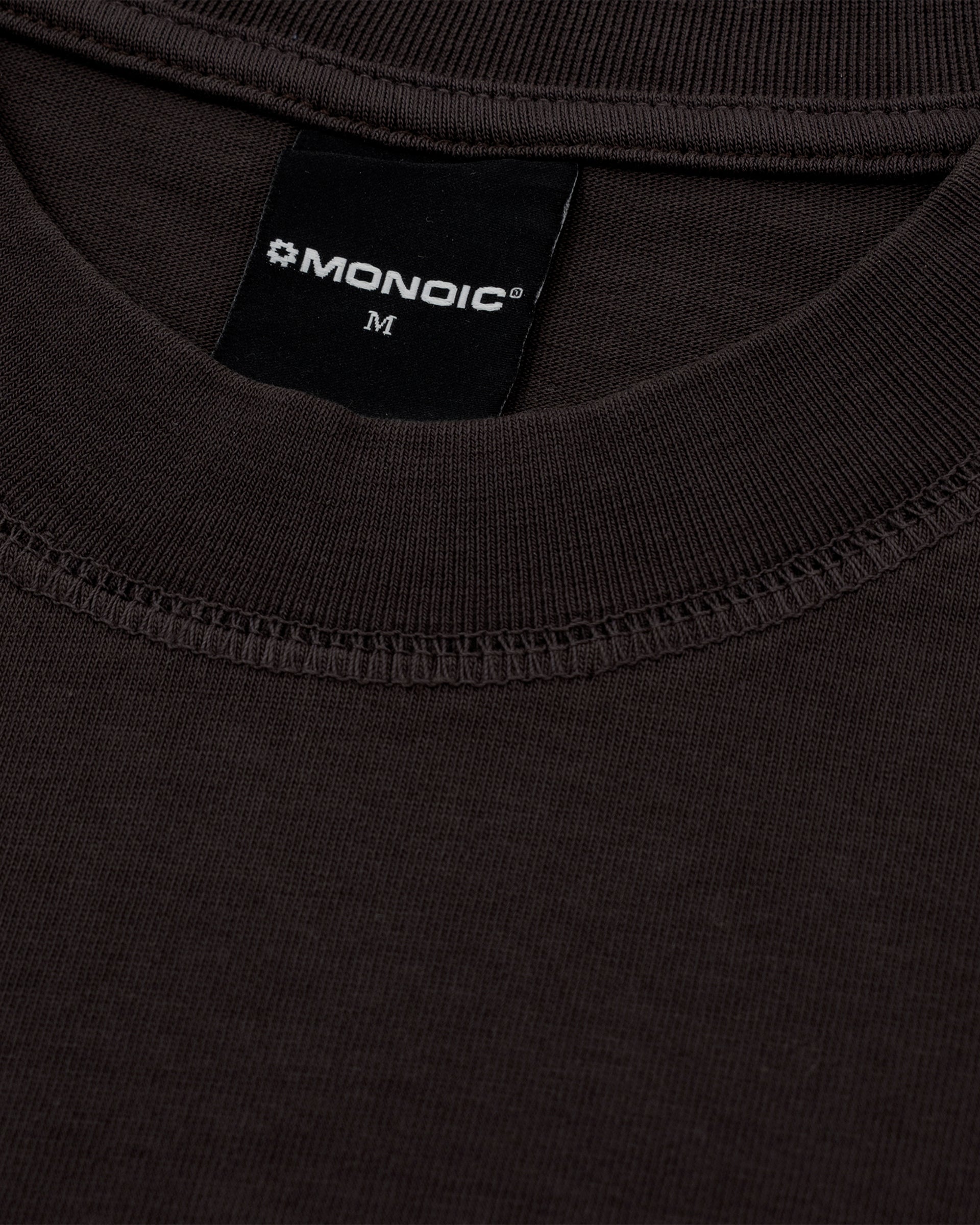 Camiseta boxy fit color Café Chocolate, confeccionada en jersey premium de 100% algodón de alto gramaje (300 gsm). Cuello redondo en rib. Logo MONOIC en serigrafía de alto relieve en el pectoral izquierdo y monograma en alto relieve centrado en el cuello trasero. Hecha en Colombia.