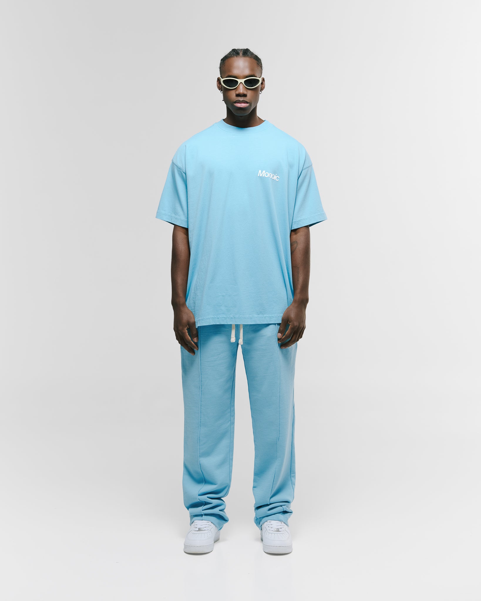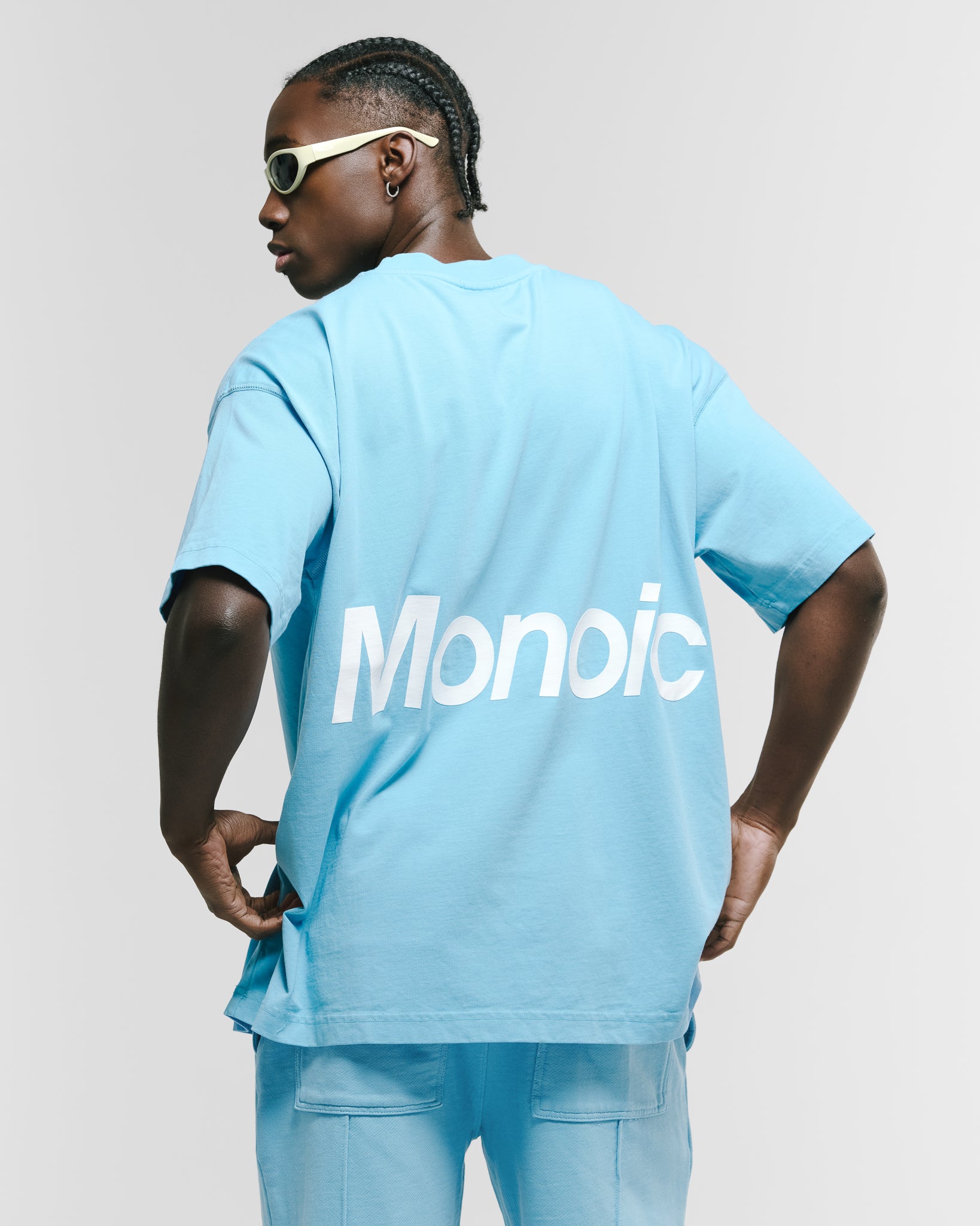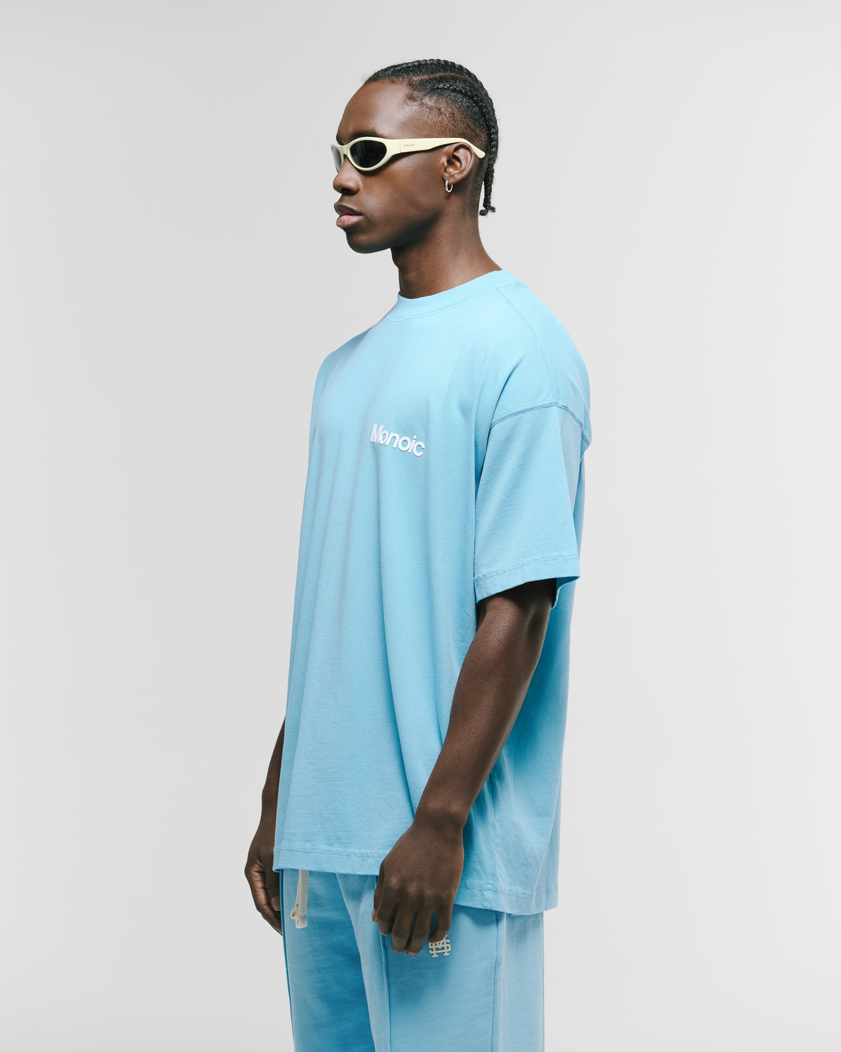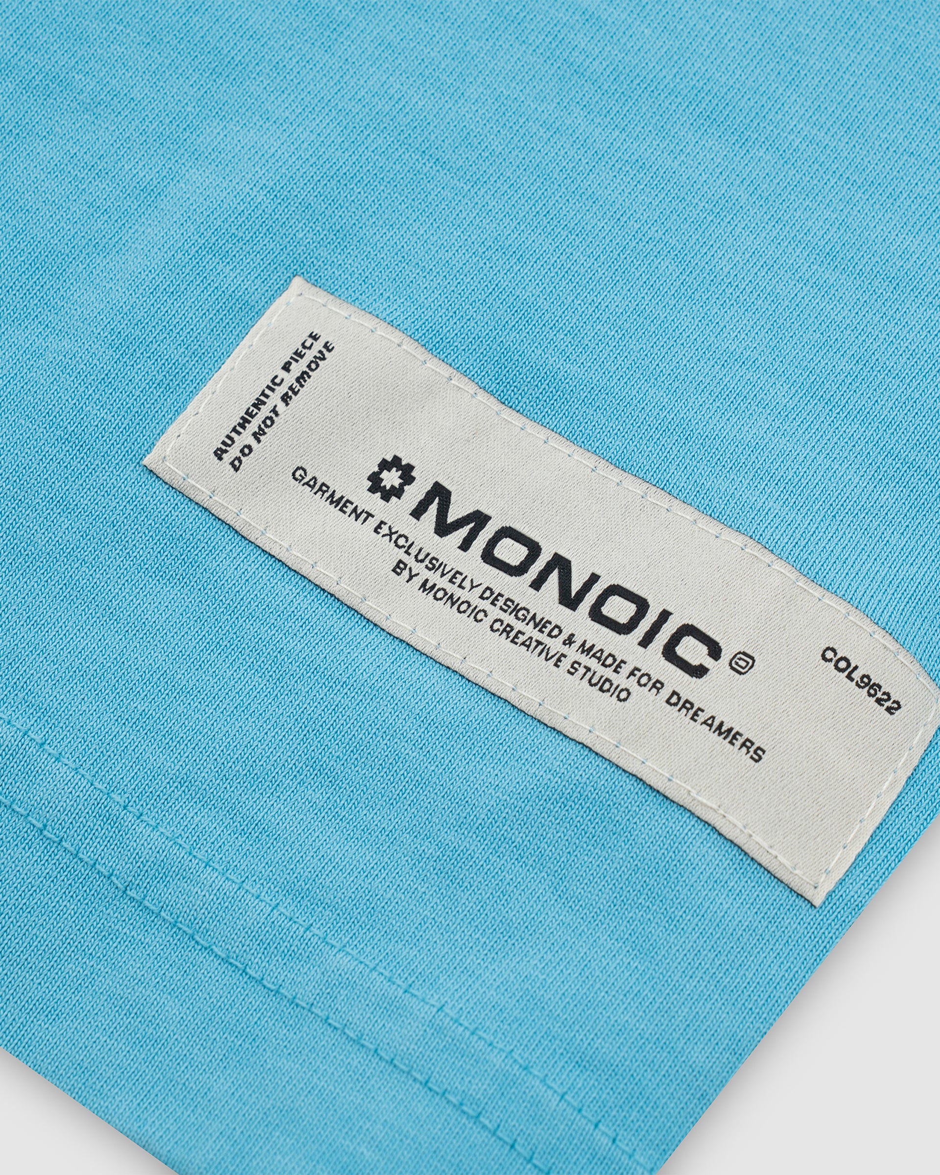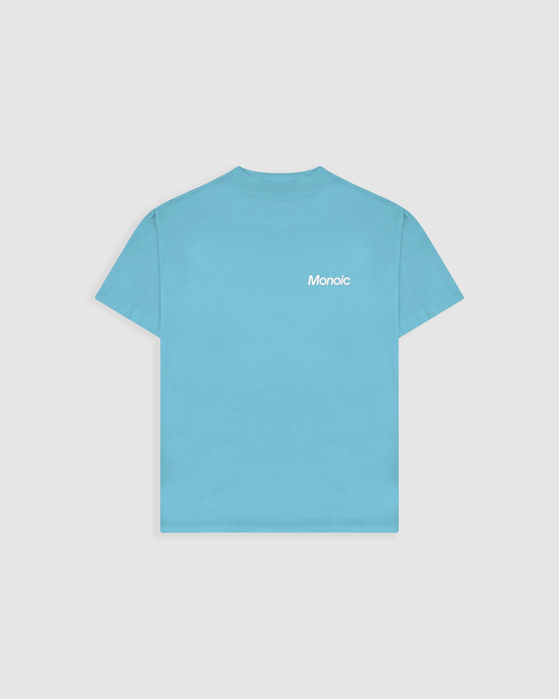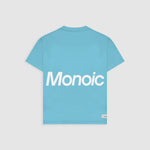 Camiseta oversized color Azul Claro, confeccionada en jersey premium de 100% algodón de alto gramaje (250 gsm). Cuello redondo en rib. Logo MONOIC en serigrafía de alto relieve en el pectoral izquierdo y estampado MONOIC en serigrafía de alto relieve en la espalda. Hecha en Colombia.