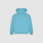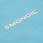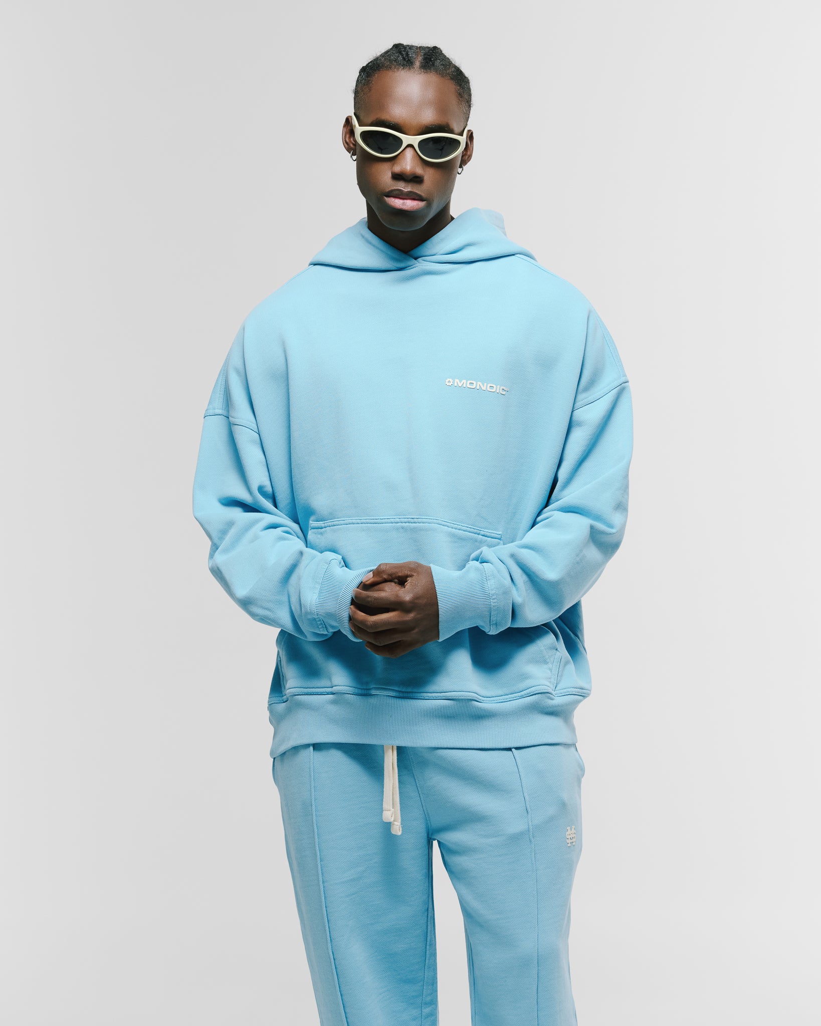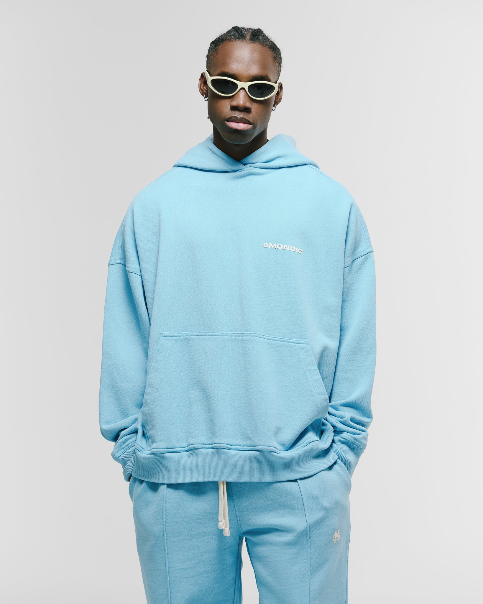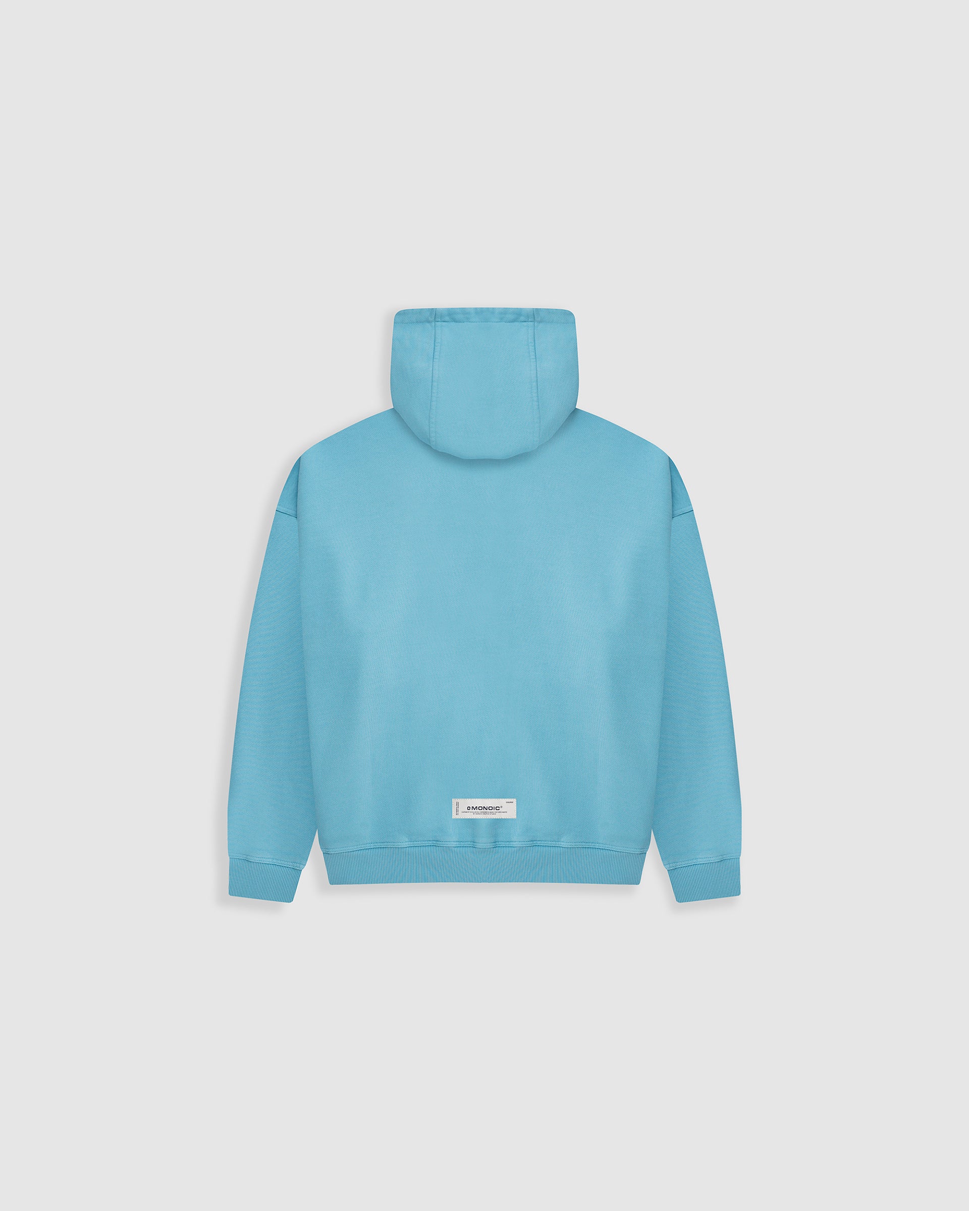 Hoodie oversized color Azul Claro, confeccionado en 100% algodón de alto gramaje (400 gsm). Pre-encogido y teñido en prenda para máxima calidad y terminación. Incluye capota, bolsillo tipo canguro, puños y cintura en rib. Logo MONOIC en serigrafía de alto relieve en el pectoral izquierdo. Hecho en Colombia.