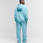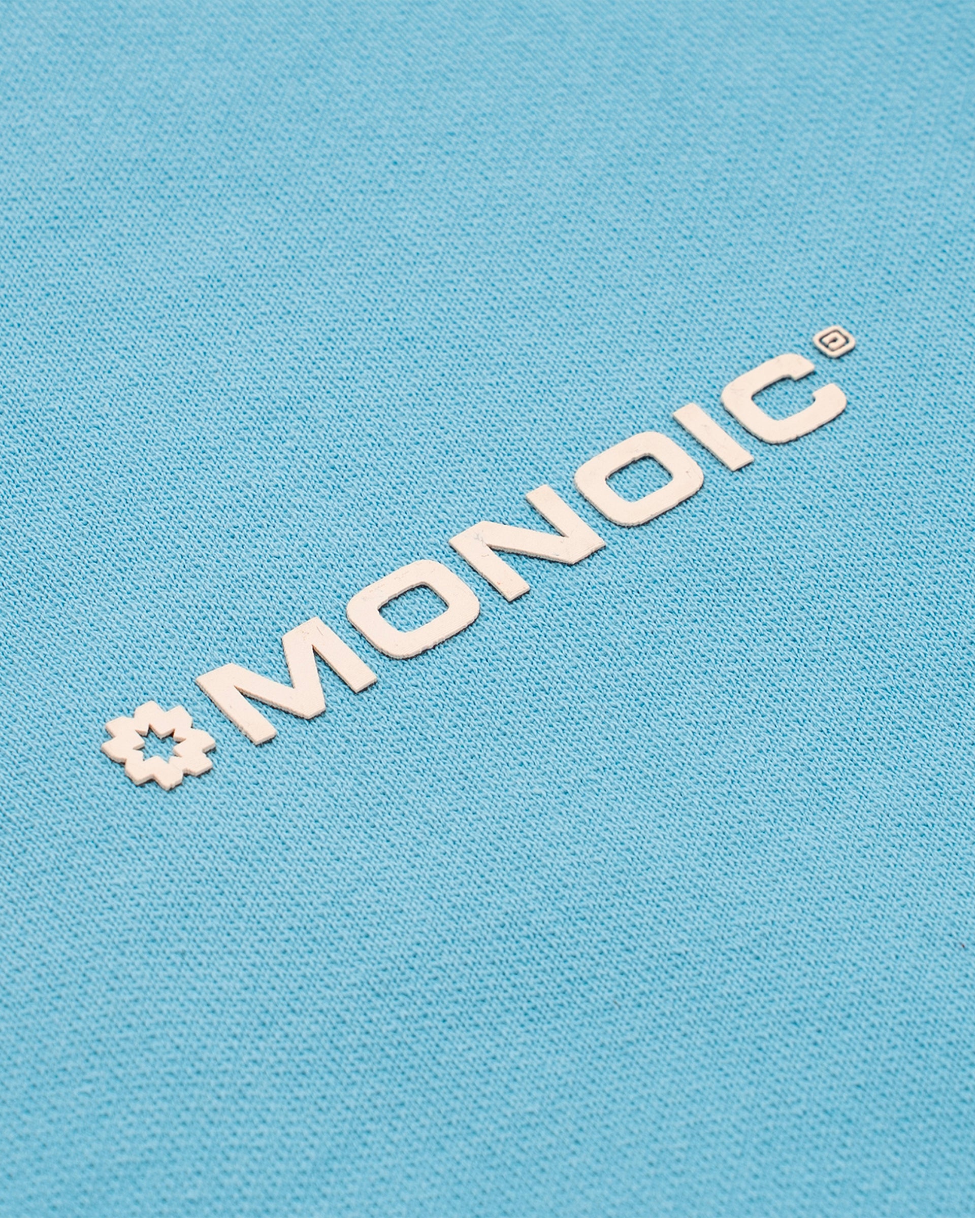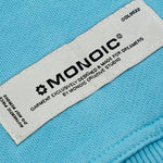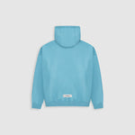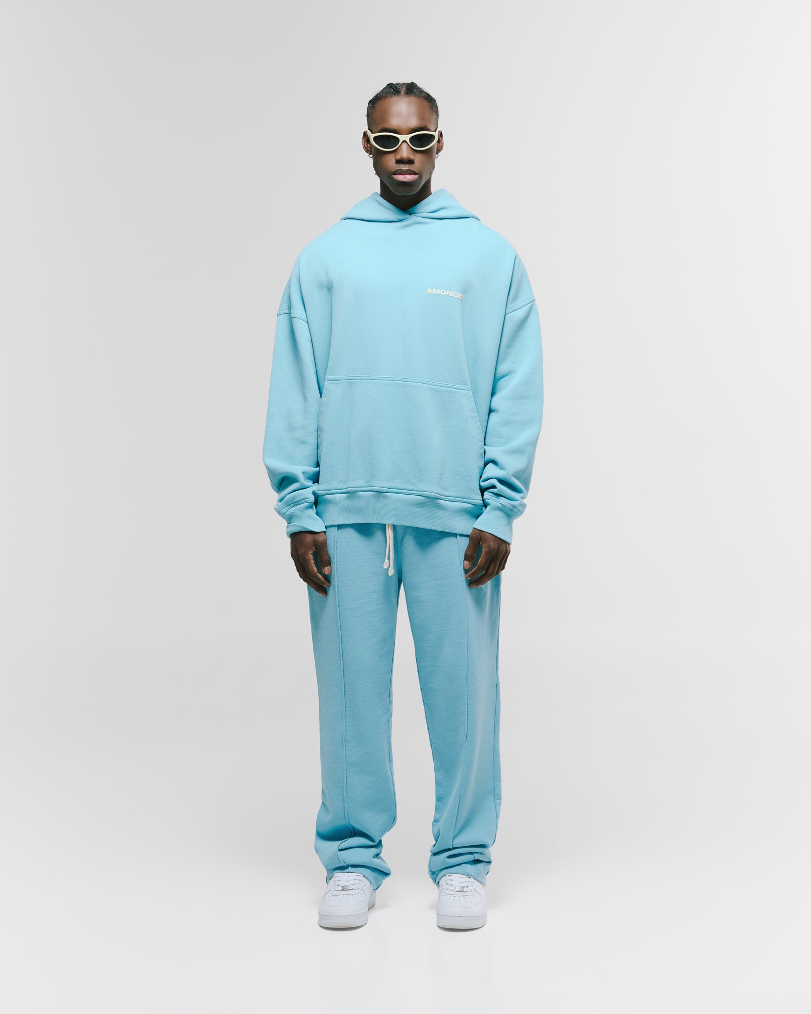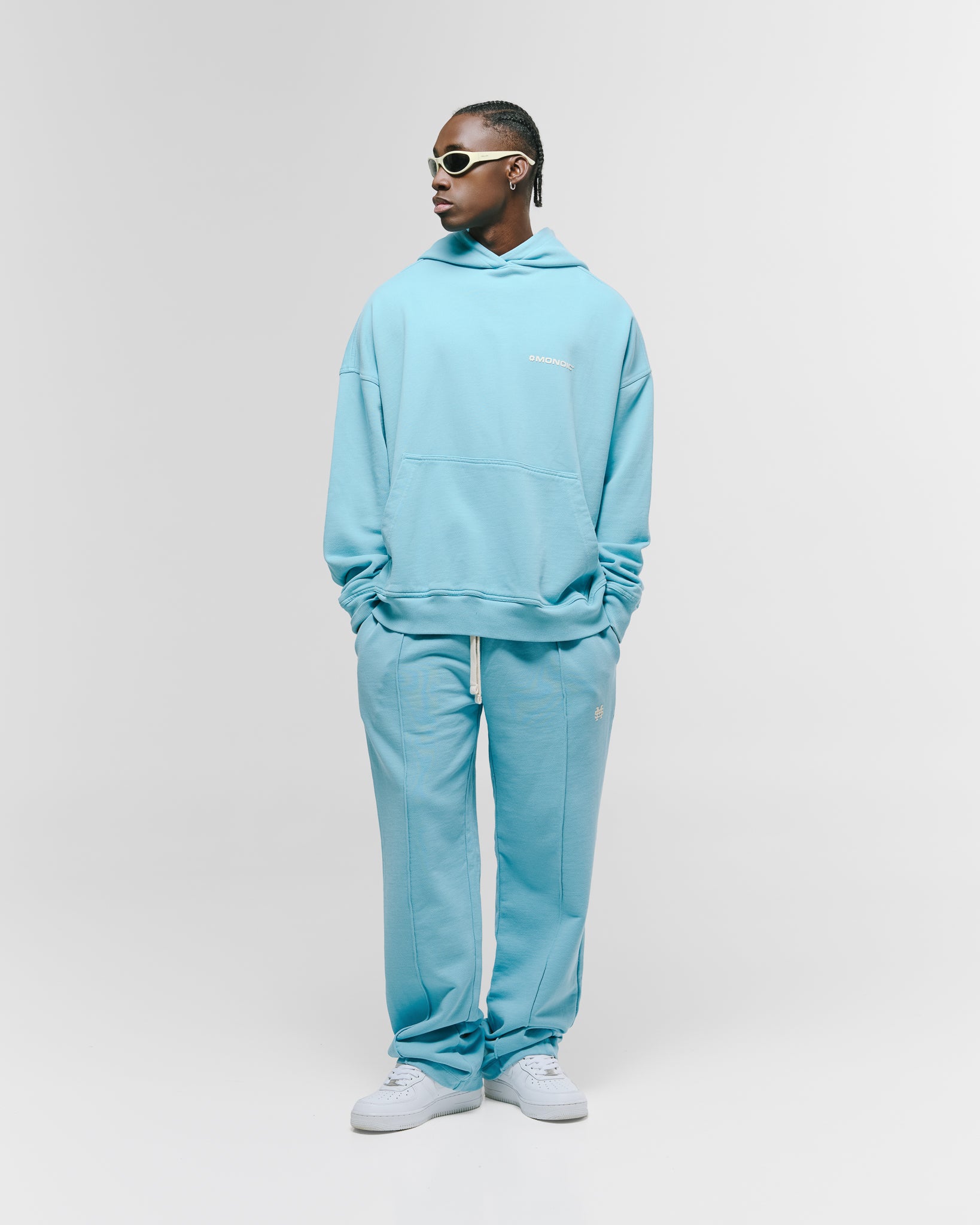Hoodie oversized color Azul Claro, confeccionado en 100% algodón de alto gramaje (400 gsm). Pre-encogido y teñido en prenda para máxima calidad y terminación. Incluye capota, bolsillo tipo canguro, puños y cintura en rib. Logo MONOIC en serigrafía de alto relieve en el pectoral izquierdo. Hecho en Colombia.